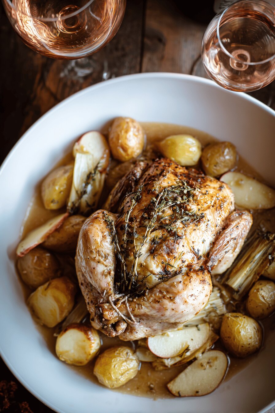 Adjust chicken size by weighing beforehand. Smaller birds cook faster, larger slower. Leek chosen over standard onion — less sharpness, sweeter notes remain after roasting without bitterness. Gala apples replace Cortland — more balanced sugar-acid. Firm apples hold shape; don’t pick mushy types or they disintegrate completely. Garlic smashed but not minced; avoid tiny pieces that char and turn bitter. Ghee or clarified butter melts better with higher smoke point than plain butter, avoid burning skin early. Marjoram substitutes thyme nicely—both herbs native to temperate climates and store dried for months. Salt entire bird including cavity for seasoning infusions. Sparkling rosé cider is Quebec specialty but if unavailable, use dry rosé combined with sparkling mineral water 70/30 ratio for bubbles and fruit aroma. Bay leaf adds subtle piney undertones, remove before serving to avoid bitterness. Keeps fungus or green mold risks down if leaves old or leaves left in too long. When shopping, get unseasoned chicken; brined or injected often disrupts cooking time and appearance of clear juices.