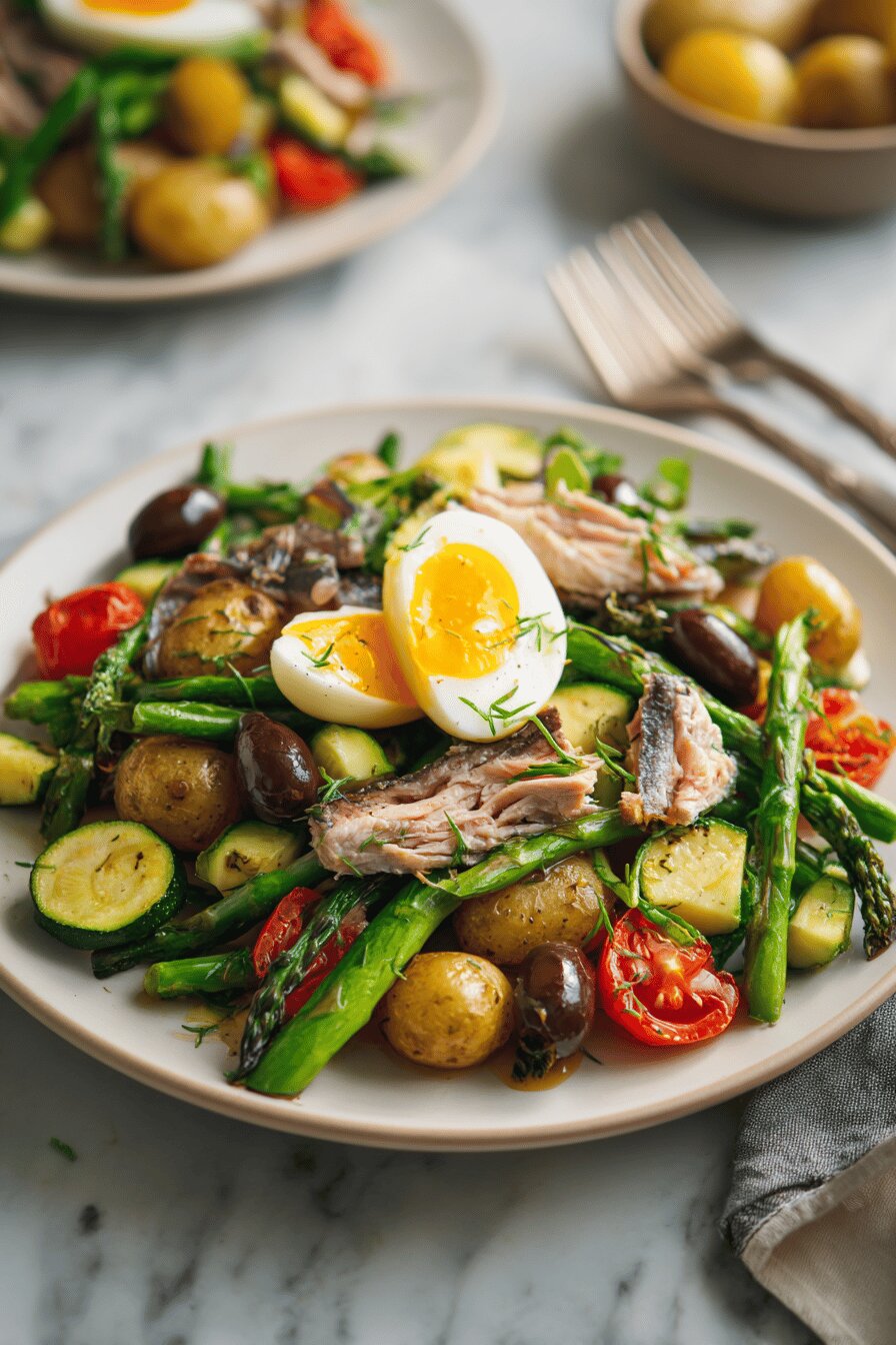 A reworked Niçoise salad with altered ingredient weights, a couple swapped veggies, and a zesty lemon twist. Rooted in classic French technique but tuned for practicality and texture. Balances tender fingerling potatoes, crisp blanched greens, and a robust vinaigrette brightened with anchovy and fresh lemon juice. Eggs steamed in a basket over simmering water, preserving moisture and ease. Tuna replaced with lightly smoked mackerel for smoke depth and heartiness. Green beans swapped to asparagus tips, offering tender snaps. Visual cues guide doneness, avoiding rubbery or mushy pitfalls. Olives kept briny; cucumber antenna sliced paper-thin for freshness. Layers of flavors deliberate but not fussy, built on straightforward execution.
