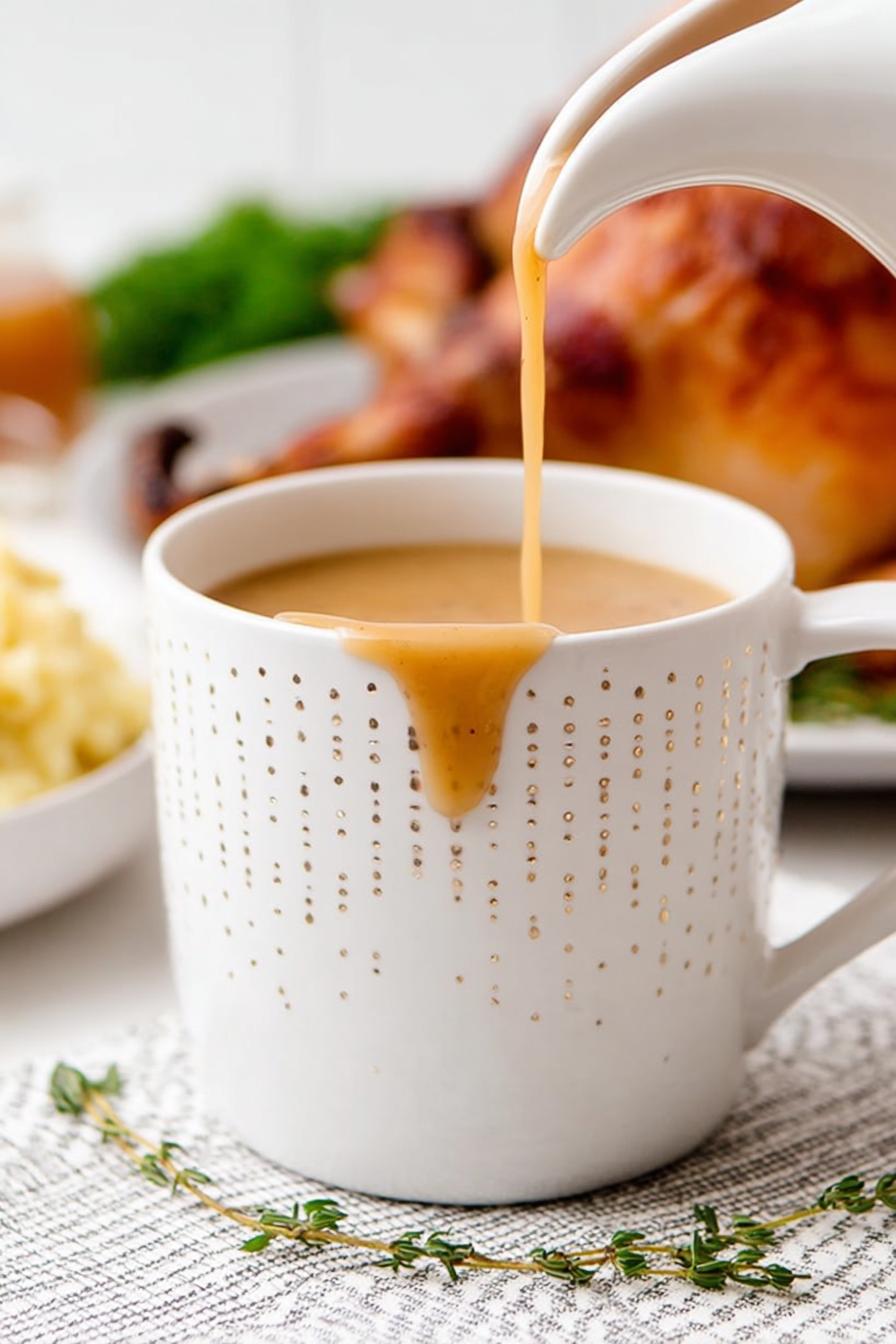Butter melted, flour whisked into a roux browning lightly for nuttiness. Slowly whisk in turkey broth and pan drippings—thickening gradually, aroma deepening. Salt and black pepper added cautiously to balance, not overpower. Optional thyme or sage for layers of flavor. Heating carefully until consistency just right—thick enough to coat, loose enough to drizzle. Adjust with broth or cornstarch slurry for fixes. Common hiccups? Too thin add slurry or reduce. Too thick whisk in broth. Salty? Dilute with water or unsalted broth. Always taste, tweak, no shortcuts. Use stock or broth substitutions, tips for drippings. Classic technique, reliable results every time.