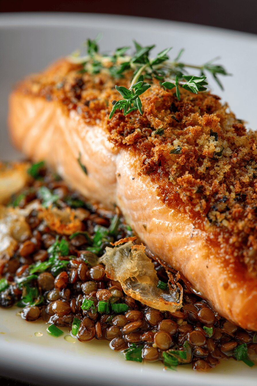 Salmon fillet roasted with honey and panko atop herbed lentils slow-cooked with aromatics and white wine. Lentils softened with clove-studded onion and bay leaf. Fresh basil and lemon zest brighten the mix. Olive oil used generously. Fish broiled briefly for crisp top and tender inside. Casual plating, hearty and textured. No dairy eggs nuts involved.