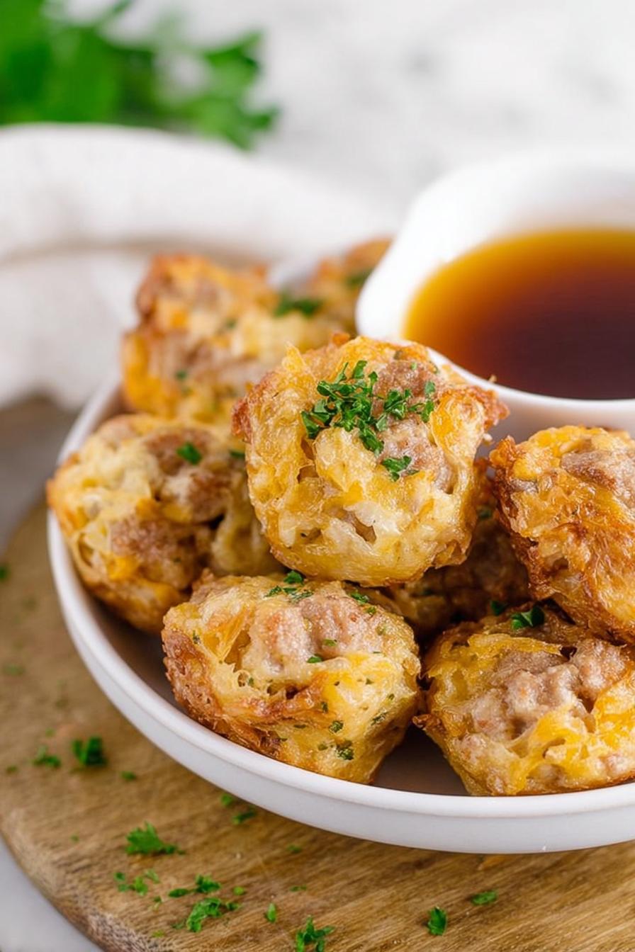 Baked potato nuggets with sausage stuffing. Golden outside, tender inside. Crispy brown edges tell you they’re ready. The blend of creamy cheese and savory pork makes these addictive. Not a mess inside from raw dough. Instead, a crumbly base with binding cheese. Mix the fat with flour just right or risk tough bites. Don’t skimp on the sausage – browned and drained to avoid sogginess. The hash browns have to be dry; squeezing frozen potatoes is crucial or they steam instead of bake. Maple syrup adds the sweet counterpoint — yes, give it a try. Rosemary in place of parsley declutters the herb scene with a sharp, aromatic note. Using Neufchatel softens the tang and keeps the mix moist but not runny. These come together quick but demand attention to texture at every step.