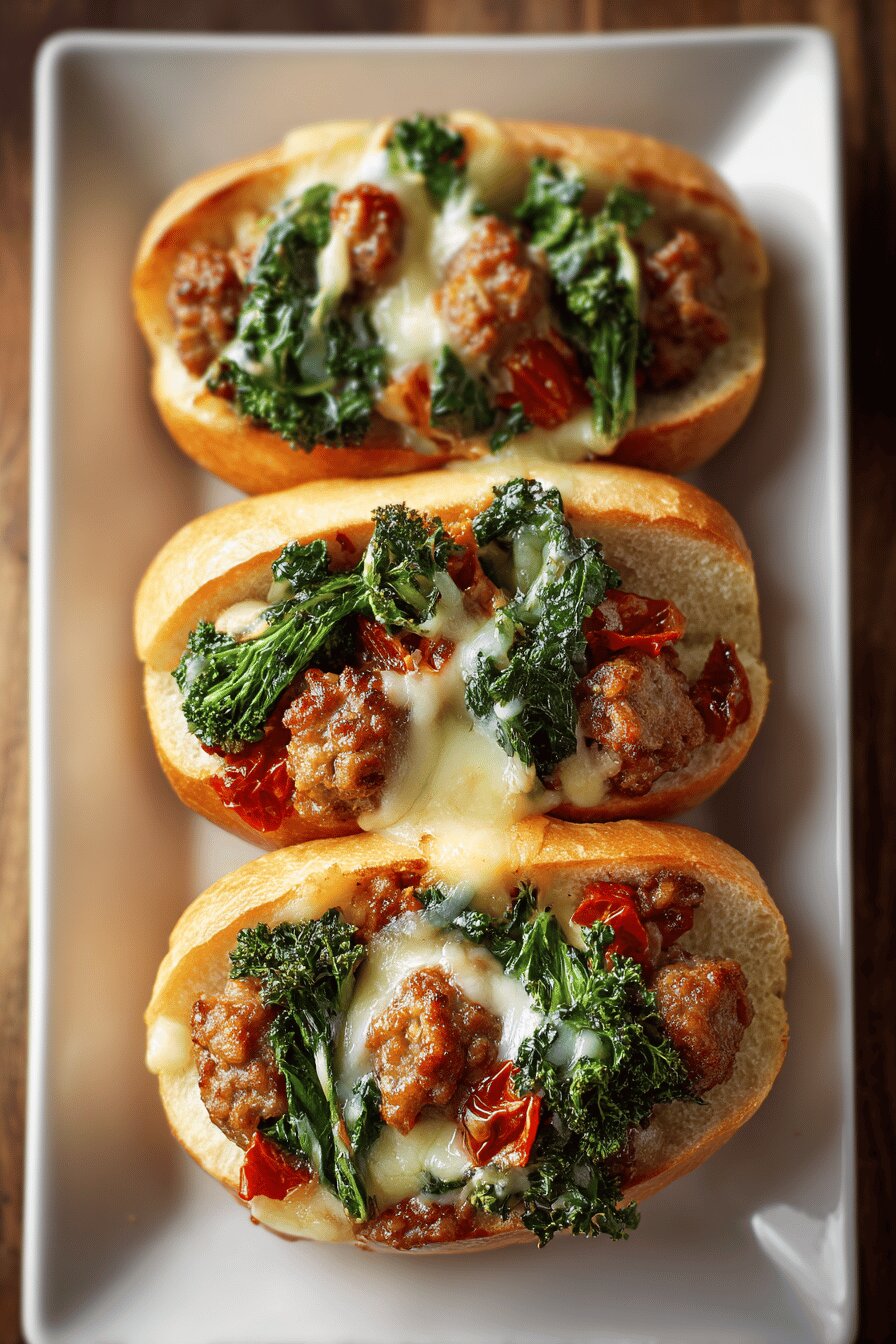 Italian sausage melded with stewed diced tomatoes and wilted rapini stuffed inside crusty submarine rolls layered with melted provolone. A hearty handheld, balancing savory meat, lightly bitter greens, and sharp creamy cheese. Techniques focus on browning sausage properly, peeling acidity from tomatoes, and blanching rapinis to just tender-crisp. Mild oily crusts warmed until cheese bubbles, then filled with the savory mess. Variations suggest swapping fennel sausage for spicy chorizo or kale for rapini to tame bitterness. Timing based on color, aroma, texture cues over clocks. Quick roast and saute. Practical tips for soggy buns and uneven cooking included.