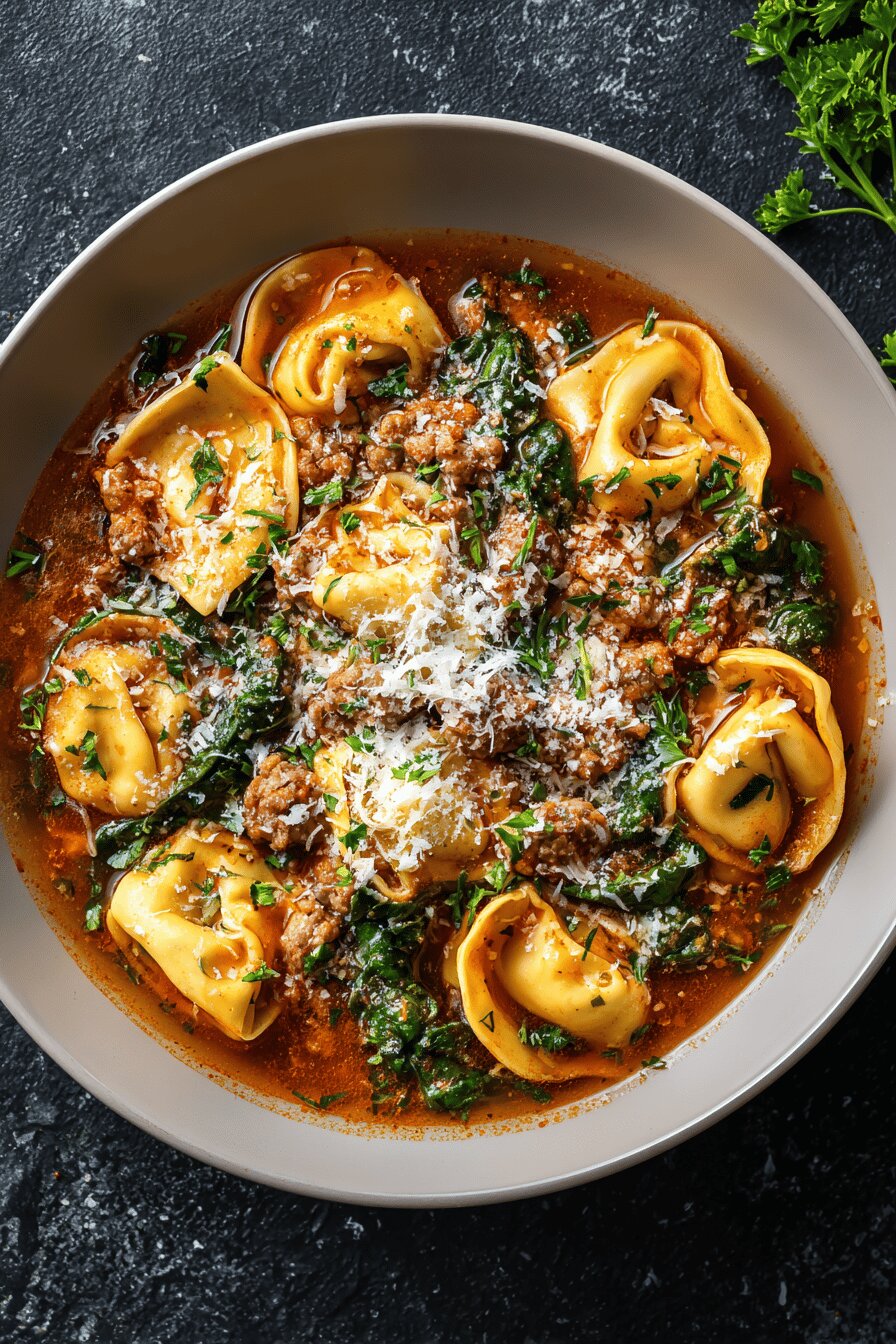 Cold kitchen, chopping shallots releases sharp scent; oil shimmers in pan. Patient browning builds deep flavor—no shortcuts here. Broth simmers, infused with herb and cheese rind, filling air with subtle umami. Ground sausage meets cheese, mix sticky and soft. Wrapping wonton sheets tricky but satisfying. Wet edges seal tightly; dough pliable, not sticky. Tortellinis bob in hot broth, cooking gently, tossing softly—bubble whispers signal doneness. Bowls ladled, sprinkled with cheese and fresh leaves. Almost meditative work, breaks monotony. Simple ingredients stretched to max potential with small precise actions. Kitchen rhythm beats steady; sounds and smells tell what clock can’t. Freeze leftover wrapped tortellinis for quick future meals. Substitutions offered for pantry gaps or dietary bends. No lavish trappings, just lean, effective cooking methods. No fuss; clear results.