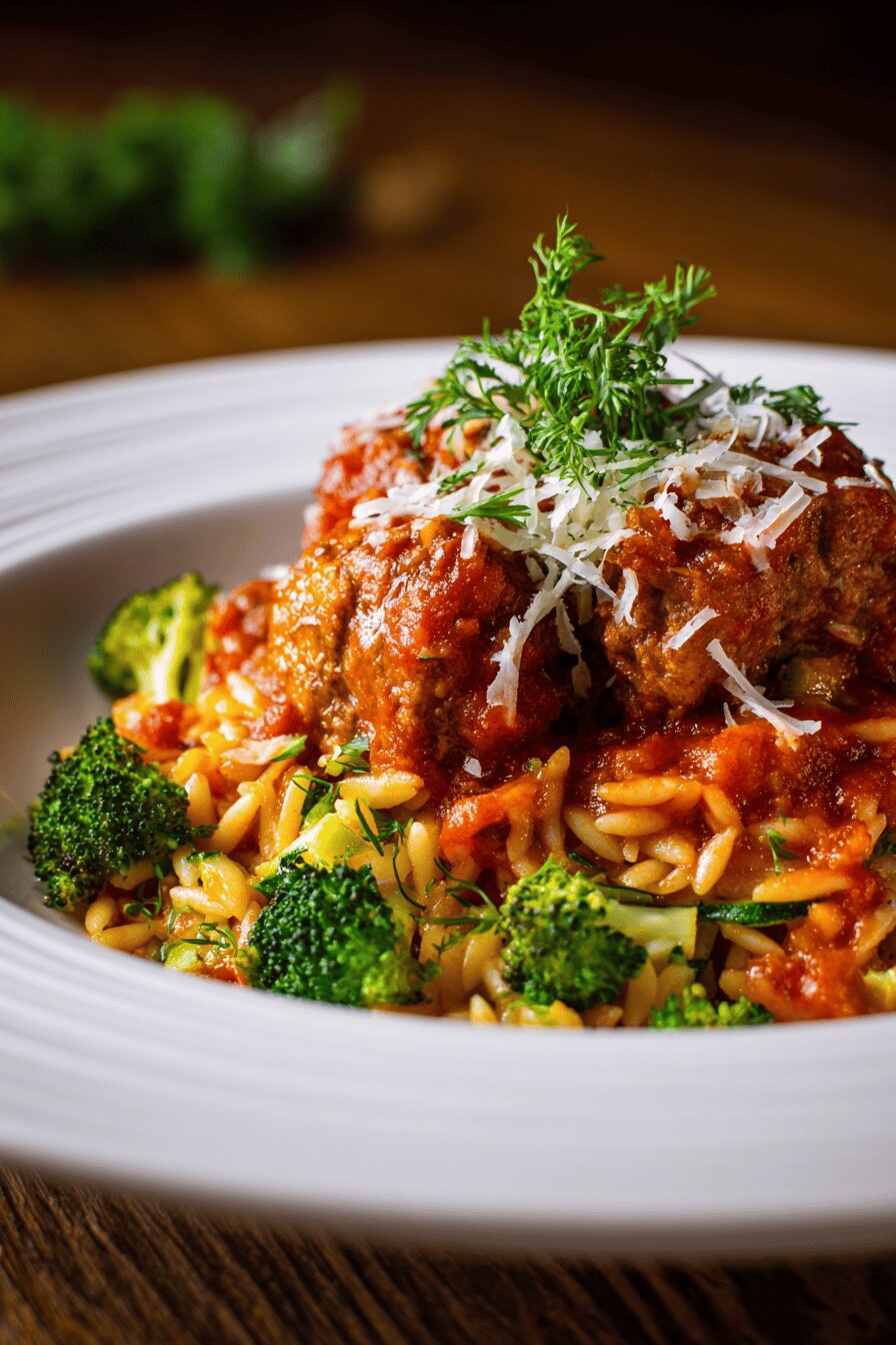 Savory pork meatballs mixed with fresh shredded zucchini roasted in a slow-reduced tomato sauce. Orzo cooked al dente then finished with broccoli grated fine and butter for richness. Balanced textures from golden browned meat to tender al dente pasta and veggie crunch. A practical meal using common ingredients with flexible swaps like turkey sausage or kale. Timing varies with oven and stove; visual cues prioritize doneness over strict minutes. Robust Parmesan flavor binding the meatballs and pasta. Broccoli added at end preserves bright green color and fresh taste. Broil step adds crisp crust, hallmark for this dish.