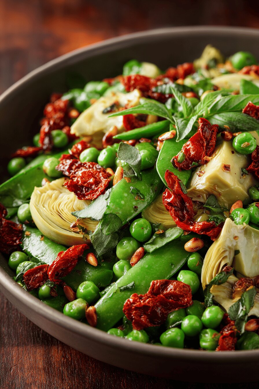 Frozen peas tossed quickly with artichoke hearts and sun-dried tomatoes. Garlic hit and fresh herbs. Uses olive oil instead of butter. Lemon zest for punch and toasted pine nuts added for contrast. Simple, fast, green. Five-minute sauté to keep peas al dente. Mixing freshness and nuttiness. Salt and pepper to finish. Bright and earthy. Textured. No cream, no dairy, no fuss.