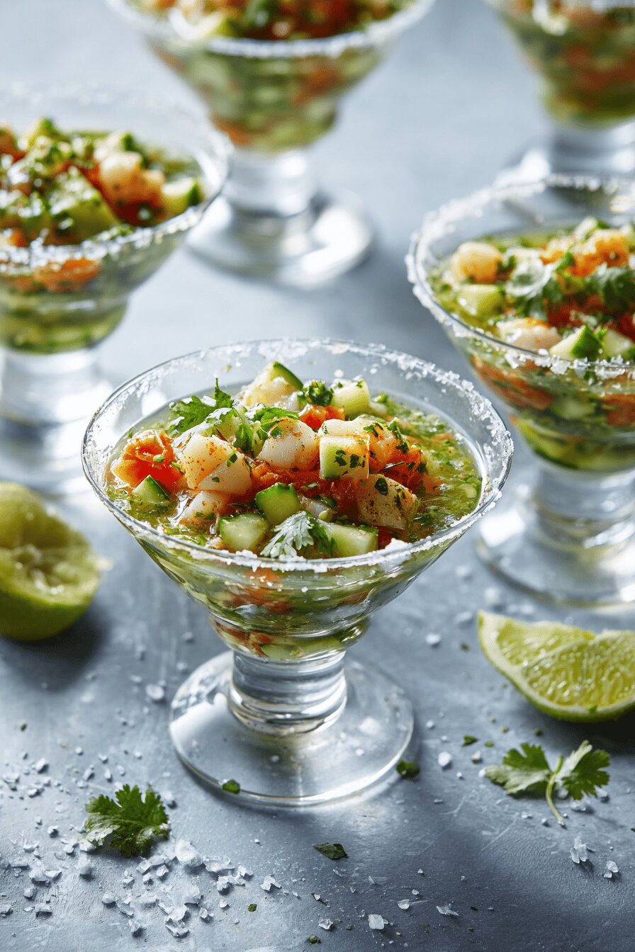 Quantity adjustments important. Cut scallops down 25% to keep every bite firm and manageable when diced. Fire-roasted tomatoes chosen for their smoky aroma—buy canned or roast fresh; skin and seeds removed to avoid bitterness and extra liquid. Zucchini swapped in avoids soggy texture common with cucumber and controls water release. Avocado oil preferred to olive oil due to milder taste and higher smoke point, handling warm kitchen better. Cilantro fresh and finely chopped gives herbal contrast; stems add bitter notes, so strip leaves clean. Salt application on glass rims tightens citrus impact; coarse sea salt works best, avoids clumping. Lime wedges serve dual purpose: glass preparation and bonus zest squeeze. Use freshest scallops available; any sign of fishy odor means skip. If scallops unavailable, firm white fish like halibut or mahi-mahi possible but texture and timing differ—watch carefully.