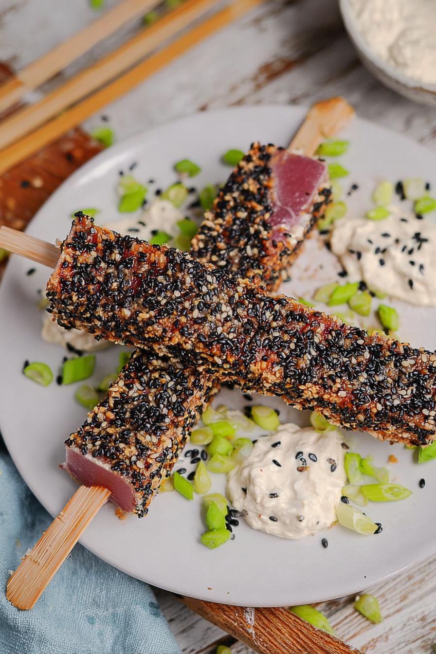 - Dollop sauce atop tuna or on the side for dipping. Serve immediately. Fresh green garnish like sliced scallions or microgreens work well, adds brightness.
