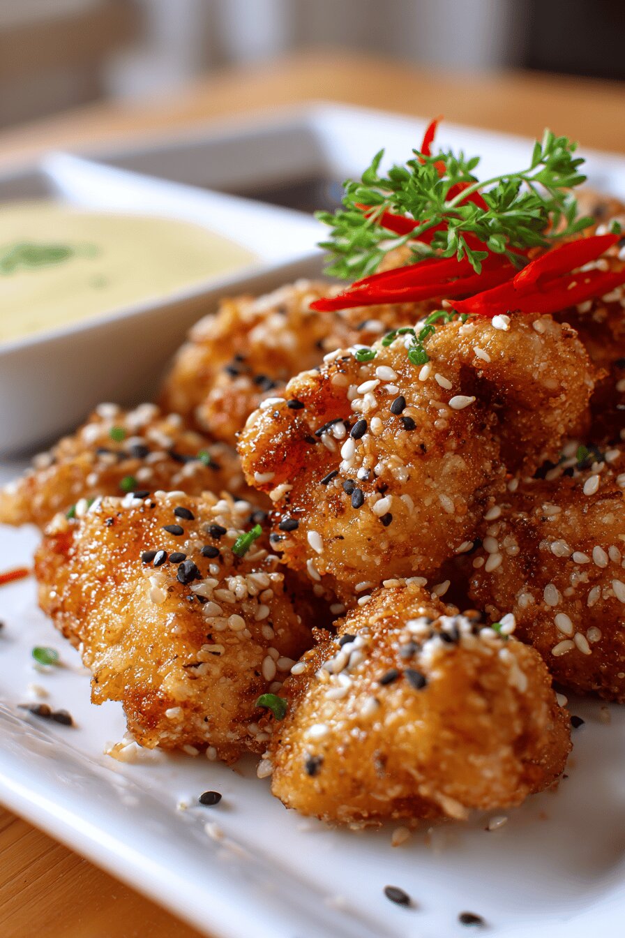 Crispy fried chicken pieces tossed in a sesame-wasabi batter. Served with a tangy wasabi mayo dip. Uses mirin and rice vinegar for a slight acidity. Flour and tapioca starch mix for crunch. Chicken breast chunks fried until golden. The mayo combines lemon juice and mirin with wasabi for a spicy, creamy sauce. Sesame seeds and toasted sesame oil add nutty aroma. Quick marinade and a 15-minute soak improve flavor balance. Serve warm with dipping sauce. No dairy or nuts. Asian-inspired flavors. Salt, pepper, and a hint of black pepper crush. Careful frying prevents spatter. 4 to 6 servings, around 40 minutes total.