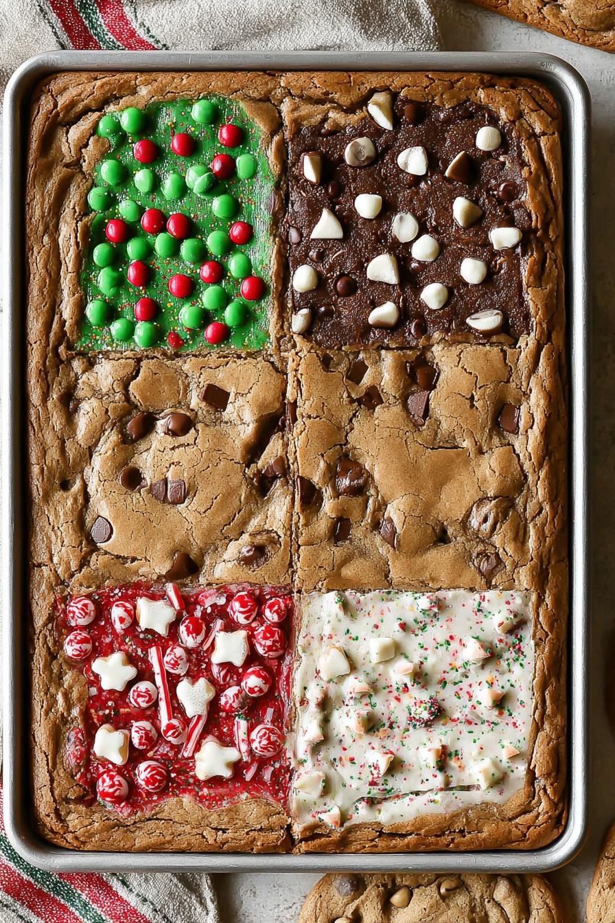 Cookie dough divided, spiked with nuts, dried fruit, chocolate fractions. Sheet pan replaces individual scooping—cuts-time-and-cleanup advantage. Melted butter and sugars beaten till no bumps. Eggs milk vanilla follow—pantry staples transformed. The dry combo folded in, glaciers of flour but don’t overwork or gluten’s grip steals chewiness. Split into quarters, toss add-ins separately. Press down dough, connecting quadrants into a mosaic of flavors. Bake until hint of caramel on edges, center bounces back. Tap pan if puffed too much, cool fully, slice. No cookie sheet chaos here—just giant slab of seasonal treat, ready for cutting and sharing.