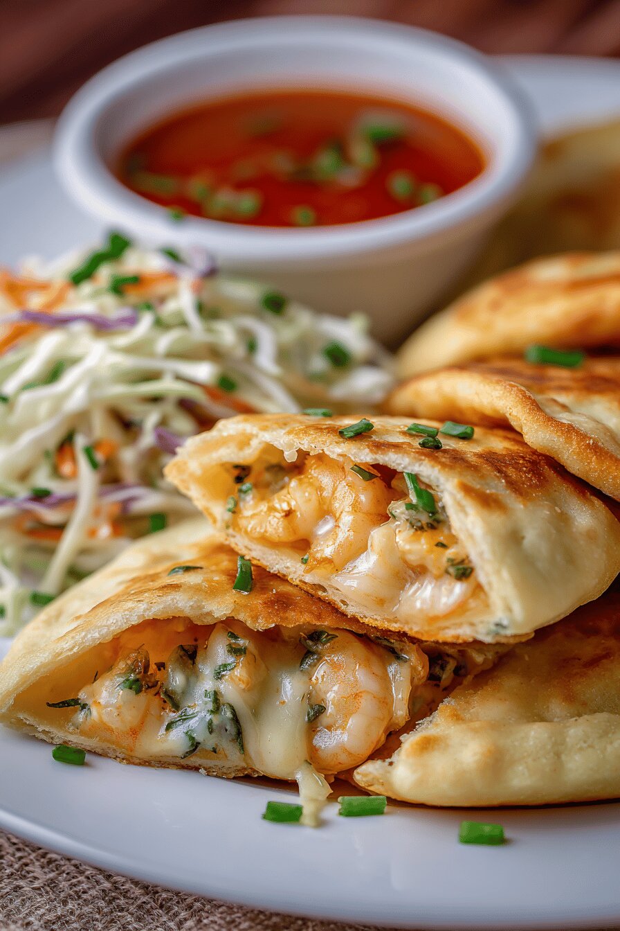 Corn dough pockets stuffed with sautéed garlic shrimp and melted Monterey Jack cheese. Uses masa harina and vegetable oil for pliable dough. Cooked till golden crisp on both sides. Serve warm with tangy cabbage slaw and spicy tomato sauce to balance richness. A twist on Salvadoran pupusas with fresh jalapeño heat, onion punch, and creamy cheese. The filling moisture controls dough texture for tender bites. Easy to make, freezes well before cooking.