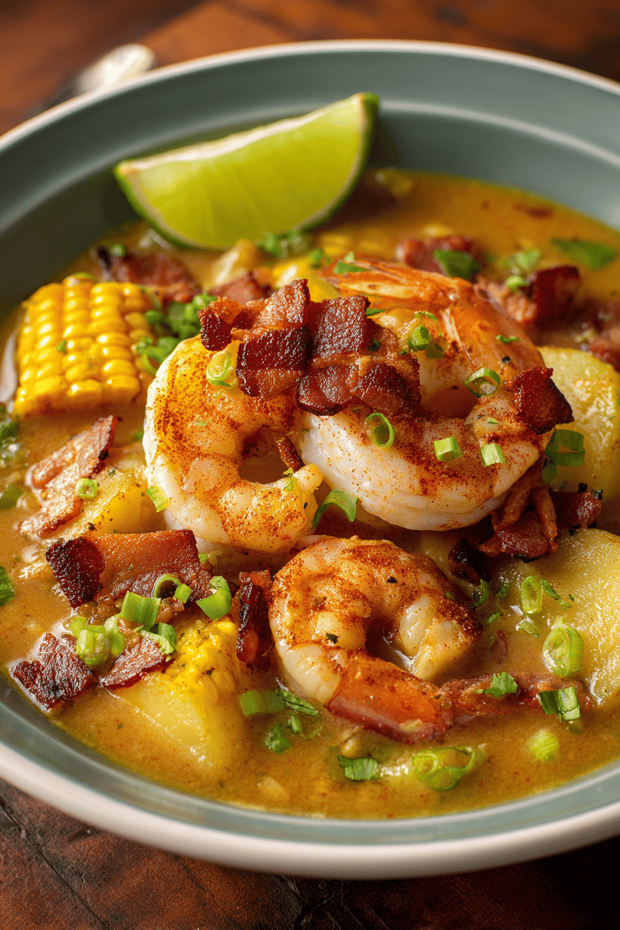 A hearty chowder with a lightly smoky bacon base, creamy potatoes, fresh corn, and Cajun-seasoned shrimp. Switched clams juice with seafood broth for depth. Slightly reduced starch and boosted fat for silkiness. Simmered potatoes to tender bite, added shrimp late to keep texture intact. A squeeze of lime at the end for brightness. Bacon reserved for crisp garnish adds punch. Easy to swap cream for coconut milk if dairy-free. Perfect for using leftover shrimp, avoid overcooking or it gets rubbery.