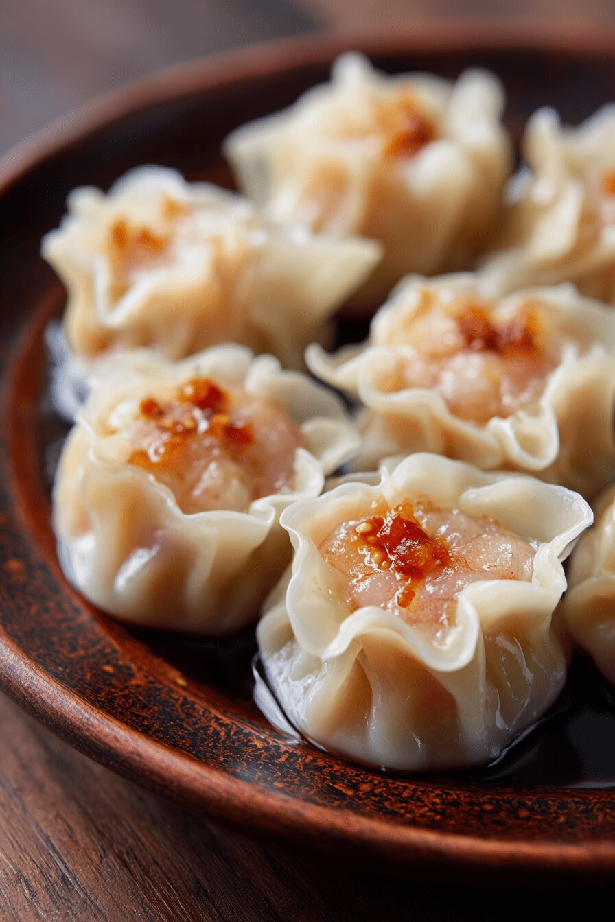 Shrimp dumplings steamed to tender, soft translucency. Bamboo shoots swapped with water chestnuts for crunch contrast. A touch of fresh ginger and soy sauce added to the filling for depth. Pliable rice flour dough wraps the stuffing, pinched tight to keep juices in. Listen for steam’s hiss, look for skin turning glossy and slightly opaque. Peel shrimp just right or raw flavor lingers. Avoid sogginess; drain excess moisture from filling. Serve with chili oil or black vinegar. No nuts, dairy, gluten-free, skim sesame oil for mild aroma.
