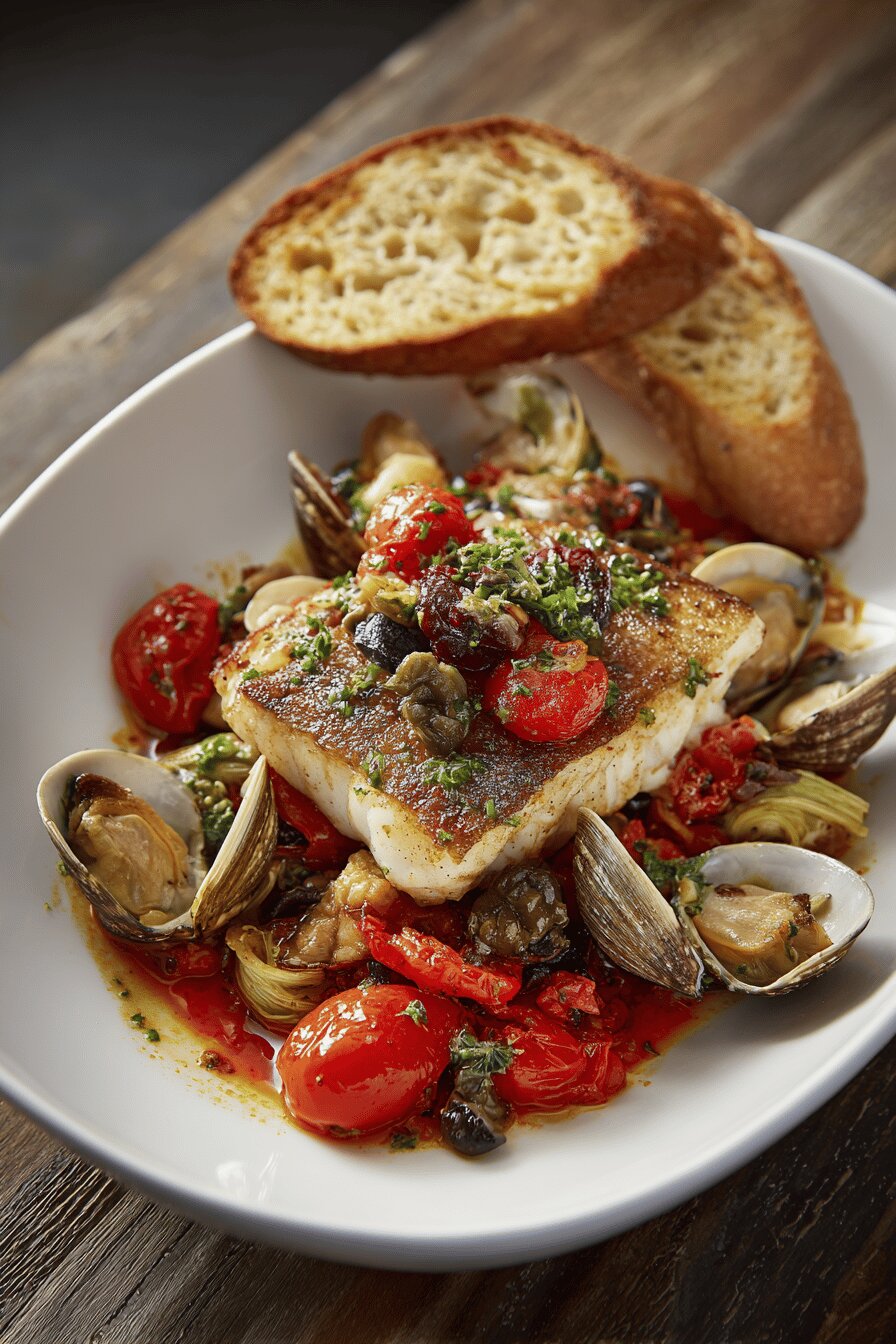 - In shallow bowls, spread a thick layer of red pepper coulis on bottom. Spoon clam mixture with juices over coulis, place fish atop. Scatter parsley leaves, drizzle with a splash of olive oil or reserved sauce. Serve with toasted rustic bread slices for dipping. Enjoy the melody of charred pepper sweetness, briny clams, and creamy fish balanced by the smoky paprika undertones.