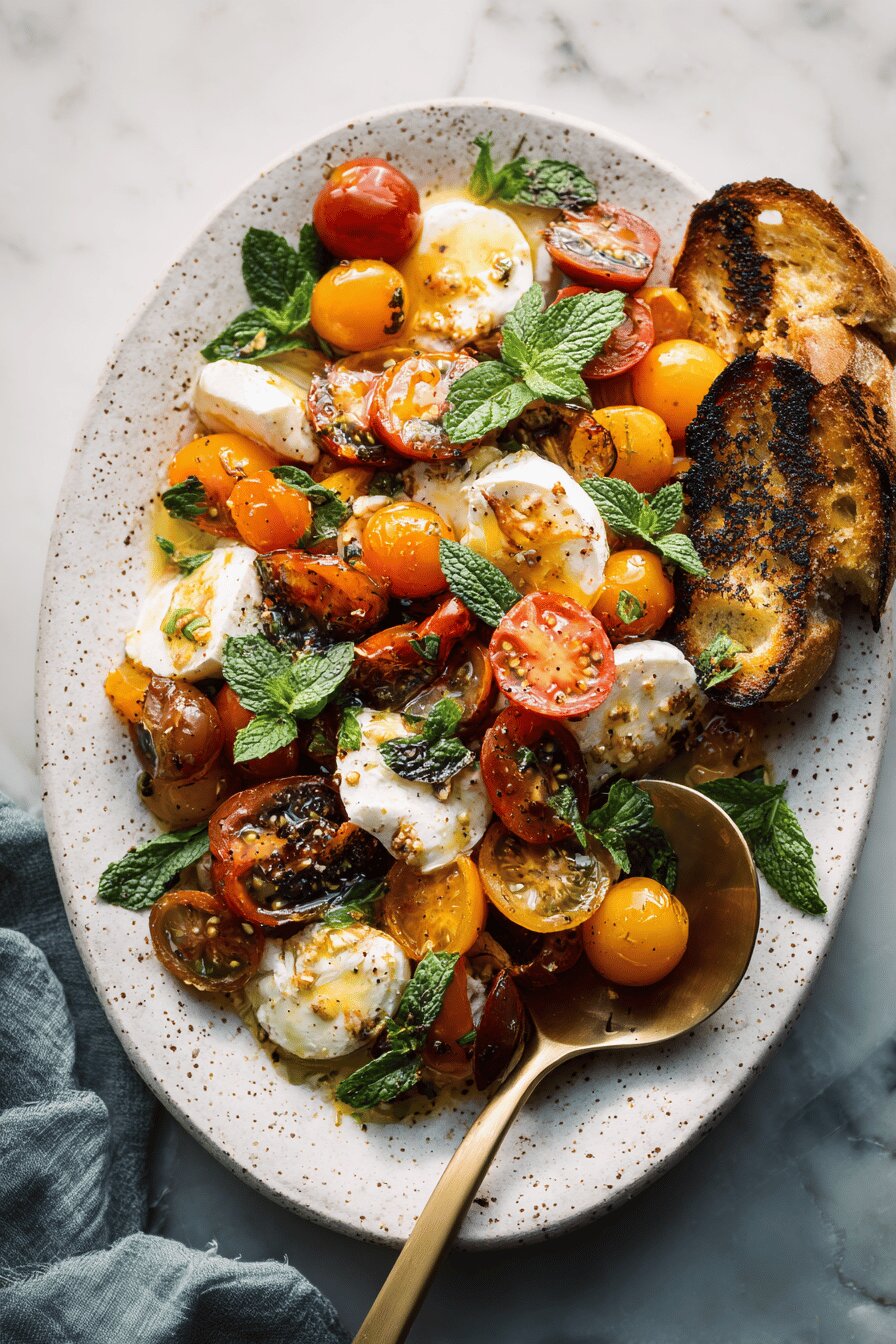 A plant-forward caprese derivative swapping mozzarella for silken tofu, marinated overnight in citrus and spice, balanced with sweet cherry tomatoes and fresh mint instead of basil. Optional smoked salmon replaces canned tuna for more depth. Quick assembly once tofu sets and the oils bloom, served with garlic-charred bread. A bright, fresh, allergen-friendly entrée. Focus on tactile firmness in tofu cubes, visual cues from tomato color shifts, and aroma from infused olive oil. Marinate long enough for flavor melding but not so long tofu breaks down. Alternative herbs and acidic profiles suggested for seasonal or pantry variations.