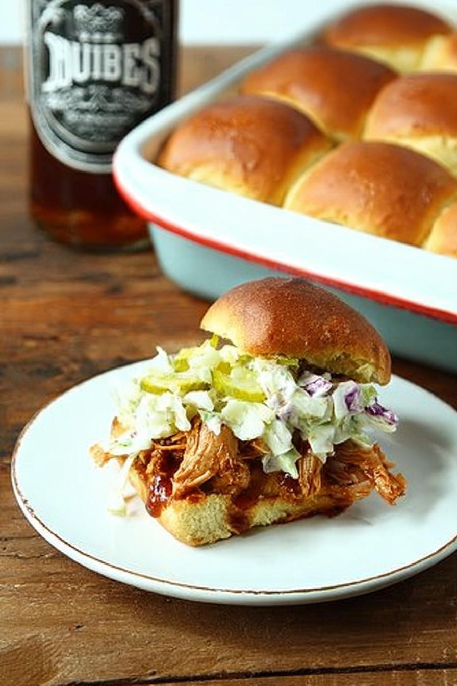 Chicken slow-cooked low and slow in barbecue sauce. Shredded tender and juicy, infused with sweet smoky notes but with a twist—soy sauce for depth, honey for caramelized warmth. It’s about watching and feeling doneness rather than clock watching. Slathered on soft slider rolls. But here’s the kicker: those rolls don’t just sit—basted with a butter glaze spiked with rub and pickled zest, then toasted to golden, crackly perfection. You get crusty edges, tender insides. Slaw is no afterthought—harsh acids tamed with Greek yogurt for creaminess, crunch from pickles, a sweet acid bite from honey and juice. Make it your way but master timing and texture first.