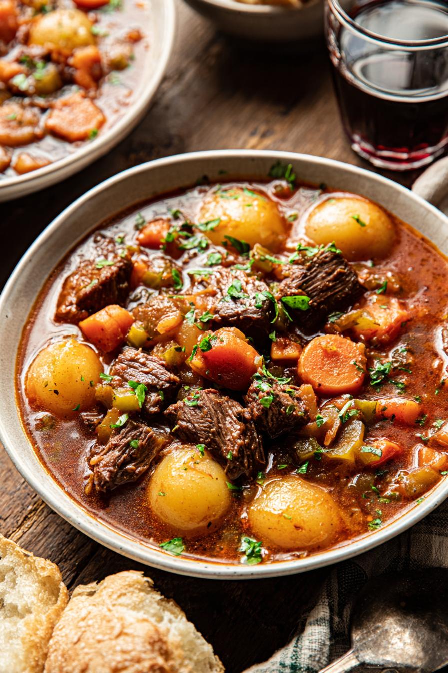 Chunky beef cubes, talc-dry, floured, and seasoned. Browned sharply in hot oil for a sear that locks flavor. Carrots, celery, onions, and small Yukon Gold potatoes layered over. A broth built thick with tomato paste, red wine swap with dry sherry, beef stock, Worcestershire, and a splash of apple cider vinegar. Fresh rosemary swapped for savory. Herbs tied with bay leaves. Slow cooked low for 7–9 hours until meat shreds easily, veggies soften but not mush. Thickened with a cornstarch slurry plus frozen pearl onions instead of peas. Butter stirred in last for creaminess. Ruled with chopped fresh tarragon or parsley. Serve hot with toasted sourdough or buttered noodles. Hearty, rustic, no guesswork.
