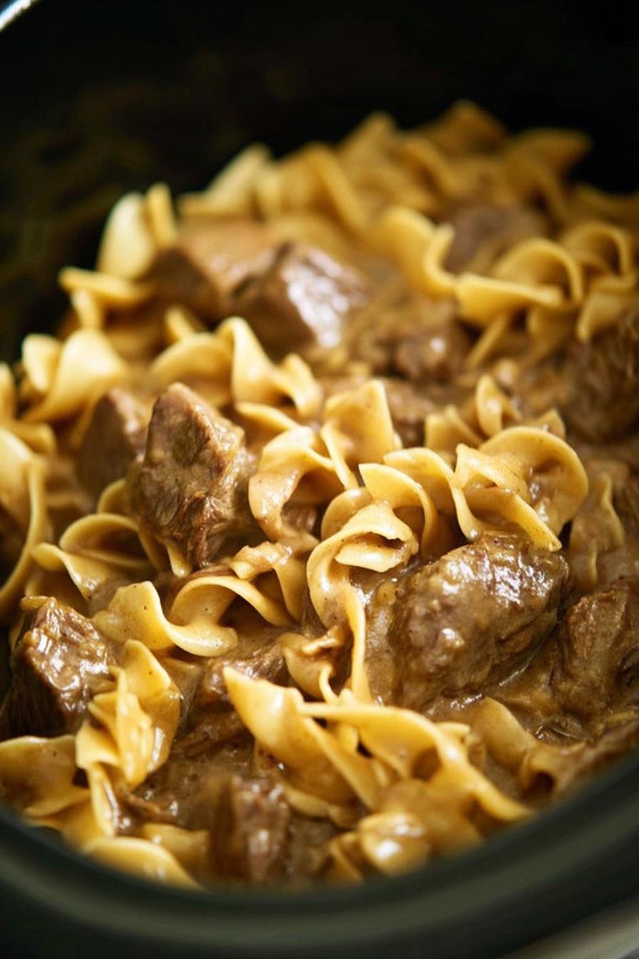 - While last cooking phase happens, boil egg noodles in salted water per package instructions. Drain, toss with tiny pat of butter or splash olive oil to keep strands separate. Option one: plate noodles, ladle beef and gravy over. Option two: mix noodles directly into slow cooker to soak. Keep warm but don’t leave long or noodles absorb all the sauce and get soggy.