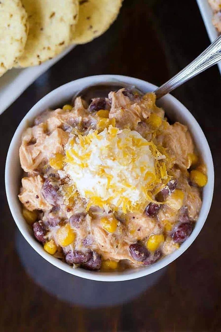 Black beans swapped for pinto beans for earthier flavor. Added diced green chilies instead of rotel for freshness; smoked paprika replaces chipotle chili powder, lending a milder smoky note. Ground coriander joins cumin and onion powder, building complex spice layers. Cream cheese remains but softened and mixed earlier to avoid clumps. Onion cooked until translucent, buttery aroma released, adding savoriness. Chicken breasts halved for even cooking, shredded when tender. Slow cooking low and steady builds melded flavors. Salt measured carefully since ranch mix, broth contain sodium. Warm bread or tortillas for serving. Calorie count roughly 95 per cup, protein around 11g.