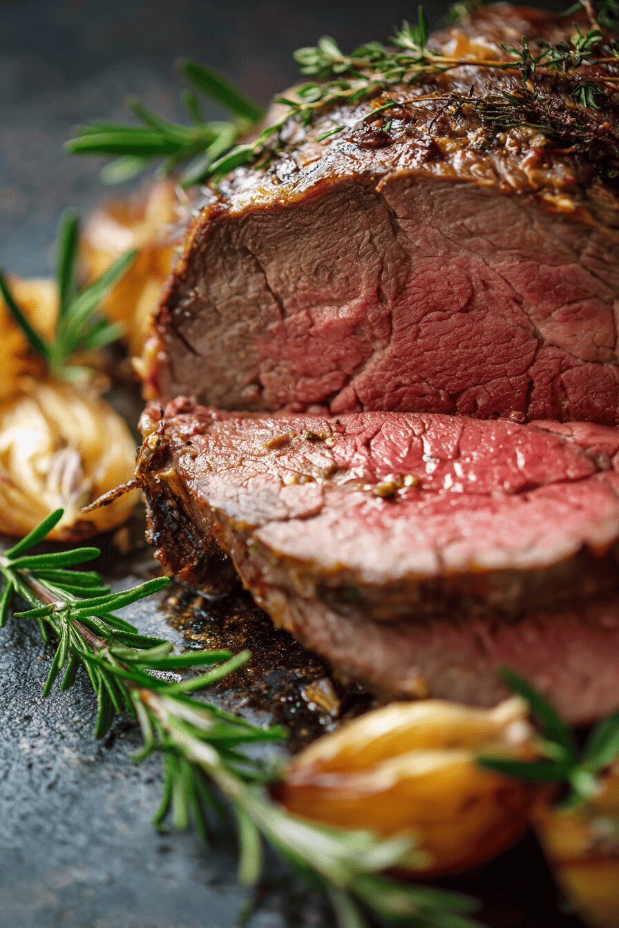Large beef roast browned then cooked low and slow. Onion and garlic form a rich bed, wine and herbs add depth. Butter swapped for duck fat, red onion replaced with shallots for subtle sweetness. Fresh rosemary instead of dried thyme. Slightly adjusted times for tenderness. Resting carefully, thin slicing. Serve with a rustic mash or root veggies.