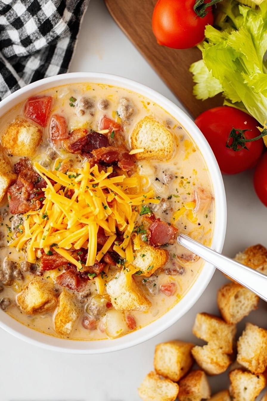A hearty soup built on browned ground beef and tender potatoes simmered in a creamy broth thickened by a butter-flour roux. Sharp cheddar melts in just before serving, balanced by sour cream’s tang. Crisp bacon crumbles and fresh tomatoes add texture and pop, while shredded lettuce and toasted bun croutons bring unexpected crunch. Chicken broth as base lifts flavors, while garlic powder and black pepper give subtle warmth. Easy swaps throughout to fit what’s on hand make this a flexible comfort bowl for cold days or whenever hunger hits.
