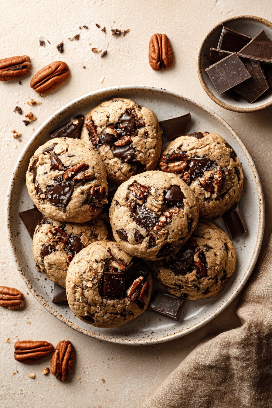 Brown butter matters, cooks off moisture, adds nuttiness. Don’t burn, timing key. Oat flour optional—adds chew, whole texture. Use pecans for contrast; walnuts or hazelnuts work too. Can replace browned butter with regular softened butter but adjust leavening slightly—baking soda needed to compensate. Brown sugar keeps moist, white sugar makes crispier cookie. Egg yolks lend richness and chew without raising dough too much. Vanilla adds complexity, pure extract preferred. Chocolate chunks bitterer than chips, chunk size affects melt. Chilling dough controls spread, improves flavor melding.