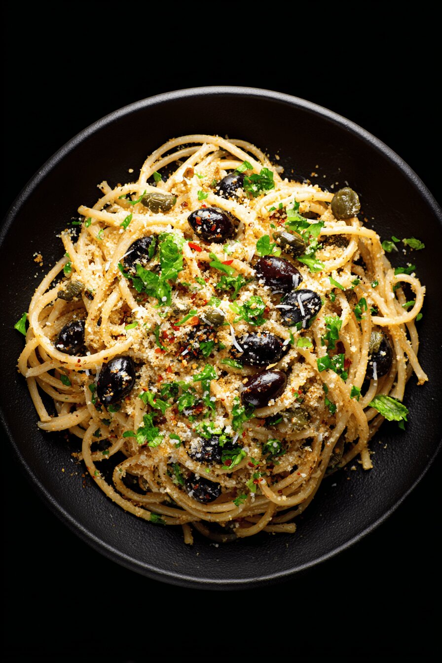 Start water so it reaches full rolling boil by time prep completes—don’t rush. Salt water generously—it should taste like the sea—but careful with salt addition later because anchovies and olives carry significant salt naturally. Don’t wash drained pasta; residual starch helps sauce cling. Oil drizzle post-drain prevents sticky clumps. Anchovies need low and slow heat to dissolve without burning. Stir with wooden spoon or spatula to break them up evenly. Garlic should become translucent, not browned, or it turns bitter; watch closely especially on pan edges. Adding remaining oil after garlic and anchovies prevents sticking and dilutes intensity, smoothing flavors together. Adjust heat accordingly. Toss pasta vigorously to evenly coat strands; use reserved pasta water to create an emulsion—do not add too much or sauce will be watery. Taste for seasoning at this stage and adjust black pepper or chili flakes, but resist over salting. Serve immediately with cheese and pangrattato on top for maximum textural impact. Leftovers tend to dry out; reheat gently with splash of water or oil only if necessary. Bread crumbs can be stored toasted in airtight container and toasted again before use to revive crunch.