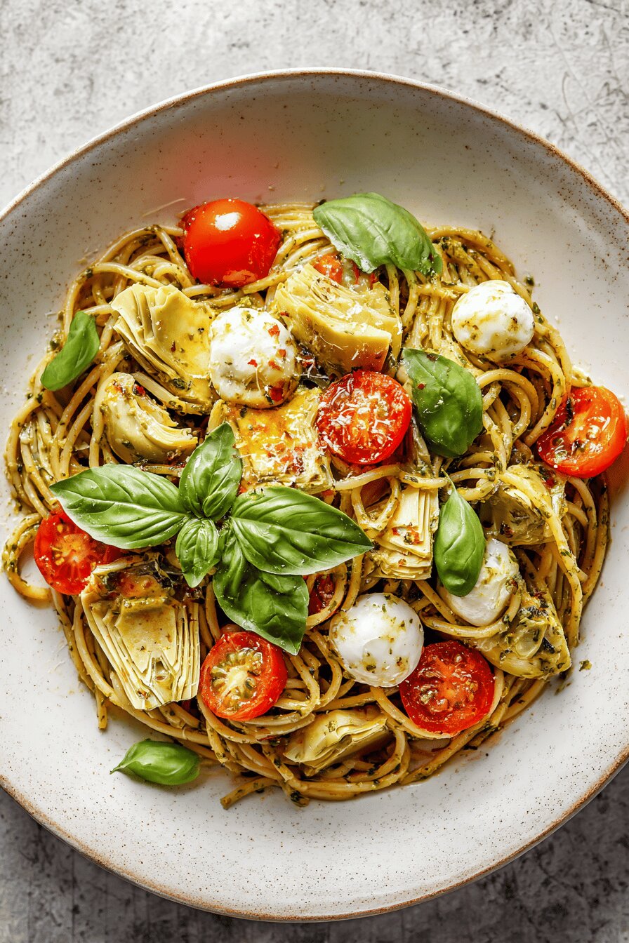 Artichokes—canned drained, halved, rinsed to remove excess brine. Ricotta salata stands in for bocconcini offering firmness and salty punch without excess moisture. Grape tomatoes peeled if too waxy or large, halving releases juice and bright acidity. Olive oil essential for flavor and sheen, choose extra-virgin for better aroma. Lemon zest must be fresh, grated finely to avoid bitter pith, provides brightness that cuts richness of cheese and pesto. Spaghetti, classic long pasta; substitute fettuccine or linguine with similar cooking times. Pesto, either made fresh or store-bought; adding spinach to basil extends volume and mellows flavor. Kalamata olives a twist, chopped small so they don’t dominate. Fresh basil torn, added last; emphasizes freshness and herbaceous aroma. Salt generously for pasta water and seasoning; pepper freshly cracked enhances savory layers.