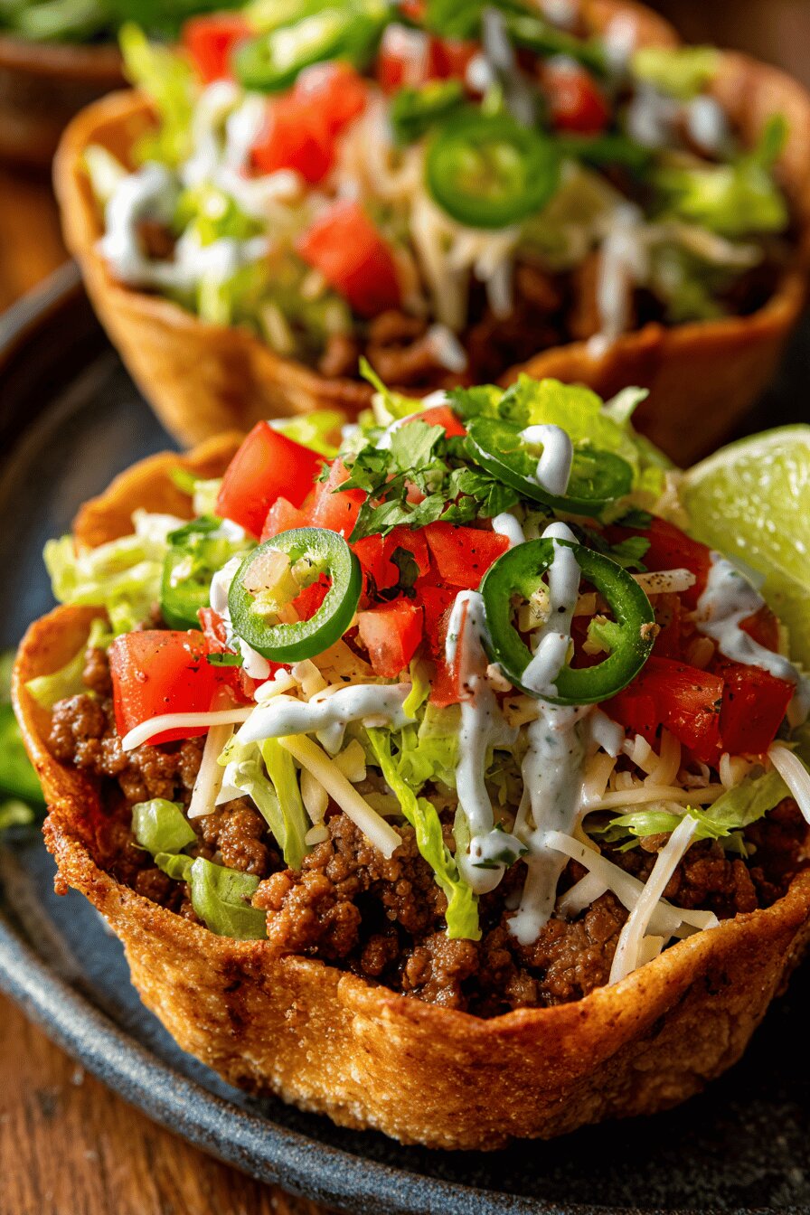 Ever feel like tossing salads with a twist? Crunchy tortilla bowls house savory, spicy beef, layered with crisp lettuce and biting cheddar or Monterey Jack. Aromas of garlic and oregano hint at something homely yet bold. Toast those tortillas just till edges brown and crackle lightly. Push them gently into bowls while warm. Cook onions till translucent and caramel hints bloom, that’s your sweet base. Beef must brown without drying; spice is scattered twice – in crust and filling – to hit even heat. Fresh tomato and cilantro brighten, while sour cream cools the heat with smooth clash. Quick, hands-on, satisfying. You’ll learn to watch, listen, and smell doneness instead of relying on timers alone.