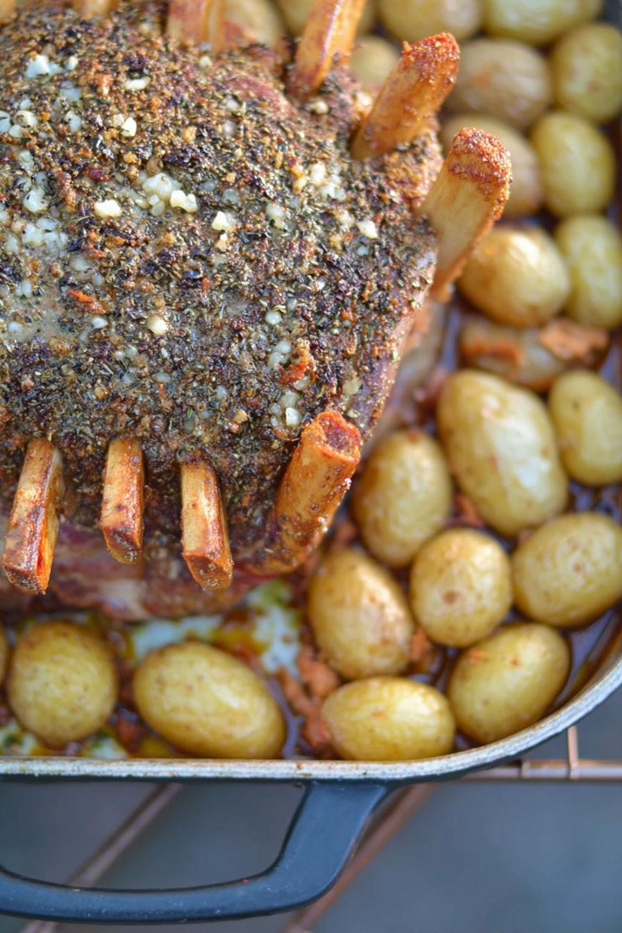 Big roast, bigger flavors. Crown cut catches heat differently. Searing first at high temp locks in juices, builds savory crust. Then lower oven lets meat cook through without drying. Rub isn’t just salt and pepper anymore—adding smoked paprika and ground coriander brings new layers in the caramelizing process, especially with that olive oil rub. Pillows of fingerlings and onions roast right in the pan juices, soaking up every essence. Resting time is non-negotiable; let the meat chill a bit so cuts hold. Good practice: trust your thermometer but also listen to the sounds—sizzle fades when oven’s right, aroma deepens as roast sings its done song. Got rosemary? Try thyme instead for subtler bite. Crust too sharp? Add less salt next round. Cast iron or heavy pan works best for collecting those pan bits. Don’t skimp on oil—helps crust, seals rub. Simple swaps for produce or equipment keep this versatile and kitchen-proof.