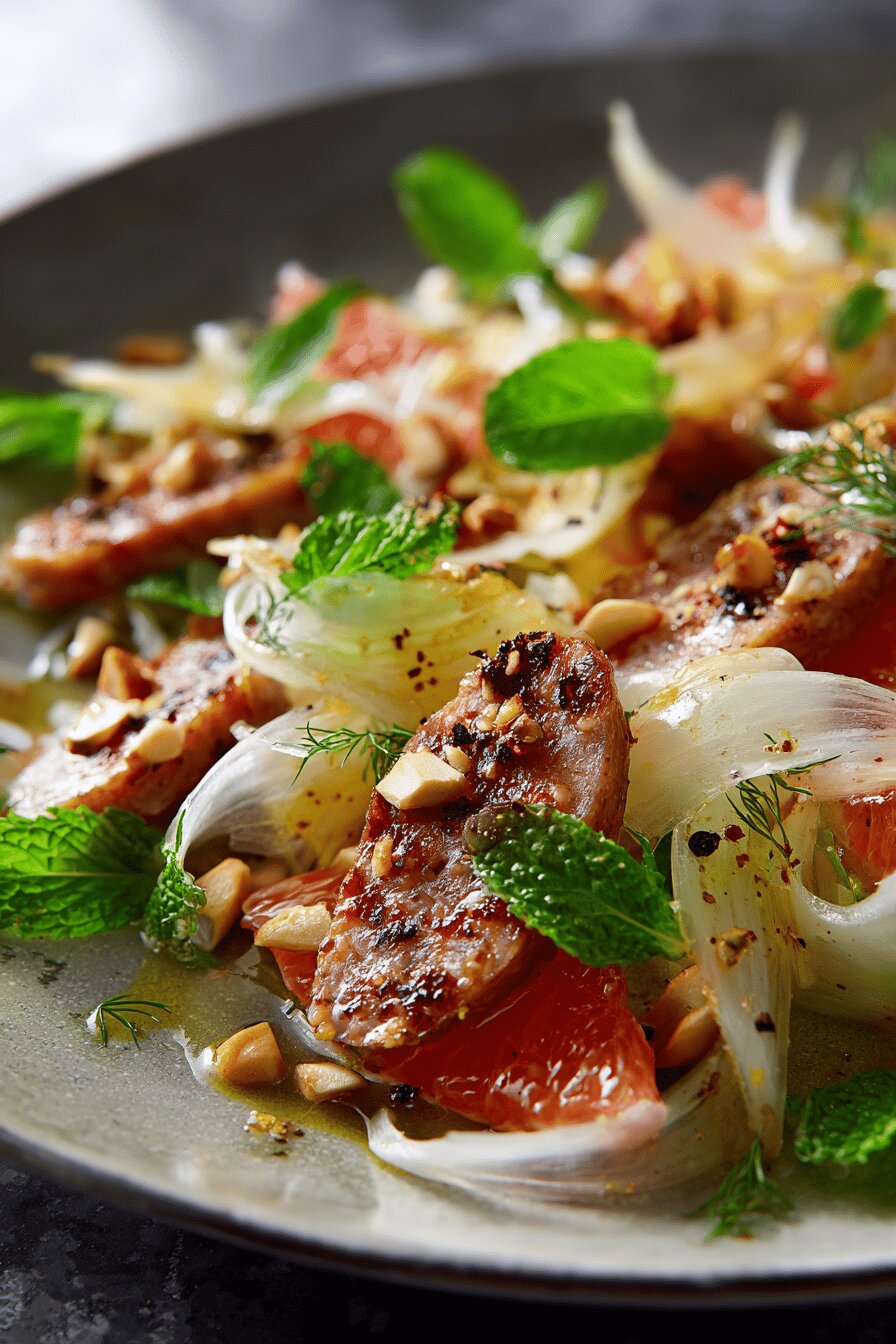 Slicing sausage on the diagonal, about 4 mm thick, helps get just right bite texture, not too thick or thin. Toast pine nuts lightly so they don’t burn; this deepens flavor and adds crunch. Mixing honey with crushed red pepper flakes first lets spice infuse before drizzling. Layer ingredients rather than mixing for visual appeal and textural contrast. Adding mint leaves scattered not crushed keeps fresh release of flavor. Use freshly peeled grapefruit supremes cut in half for juicy bursts; removes pith bitterness found in orange zest. Drizzle spiced honey last to avoid soggy layers. Serve immediately. Keeps nicely if refrigerated briefly but best fresh for crisp fennel and fresh citrus zing.