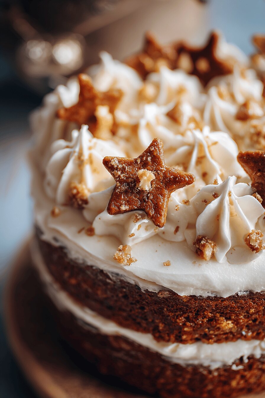 Spiced cake in layers. Airy but firm crumb. Cinnamon, ginger, nutmeg round out warm aromatics you smell before you see the bake’s golden crust crackle slightly. Swapping molasses for maple syrup tames bitterness—maple’s nuanced sweetness blends more gently into batter. Almond meal adds toothsome texture; flour alone risks too soft or gummy inside. Eggs beaten to triple volume bring life, avoid quick heavy stir-ins. The dulce de leche frosting cut with mascarpone and whipped cream balances richness and lift, not too dense like buttercream but holds shape. Proper cooling crucial—hot cake wrecks frosting, cold cake cuts clean. Final touch: spiced cookie stars for festive crisp. Tactile, sensory, rewarding. Skill, patience, attention.