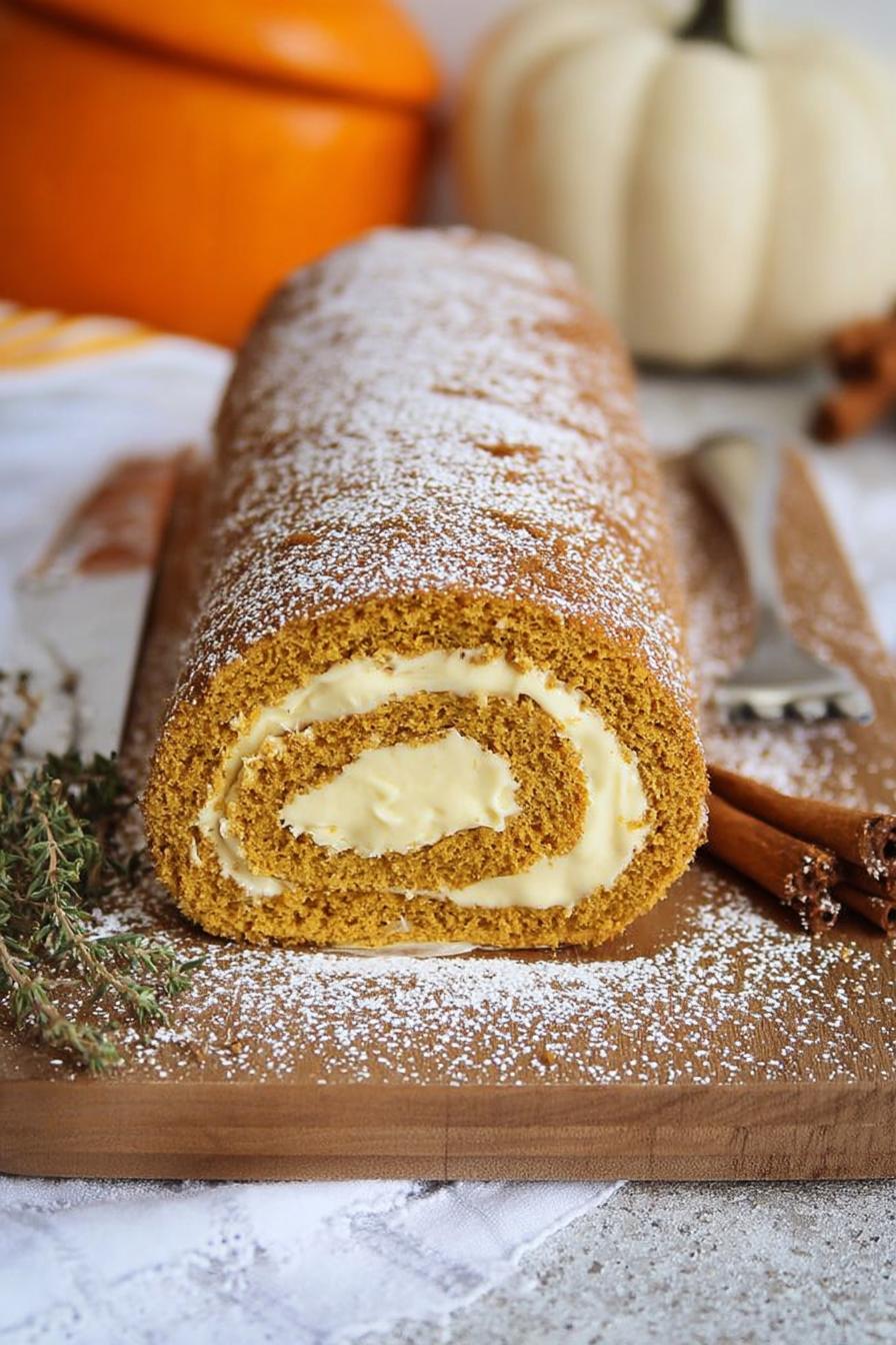 A moist spiced pumpkin sponge wrapped with tangy cream cheese frosting and dusted with pumpkin pie spice and powdered sugar. Uses pumpkin puree, basic pantry staples, and a whipped cream cheese vanilla frosting variation. Focus on tactile cues to avoid drying out the cake. The batter blends wet and dry separately to maintain structure. Rolling the cake while warm prevents cracks. Chilling firms it up for neat slicing.