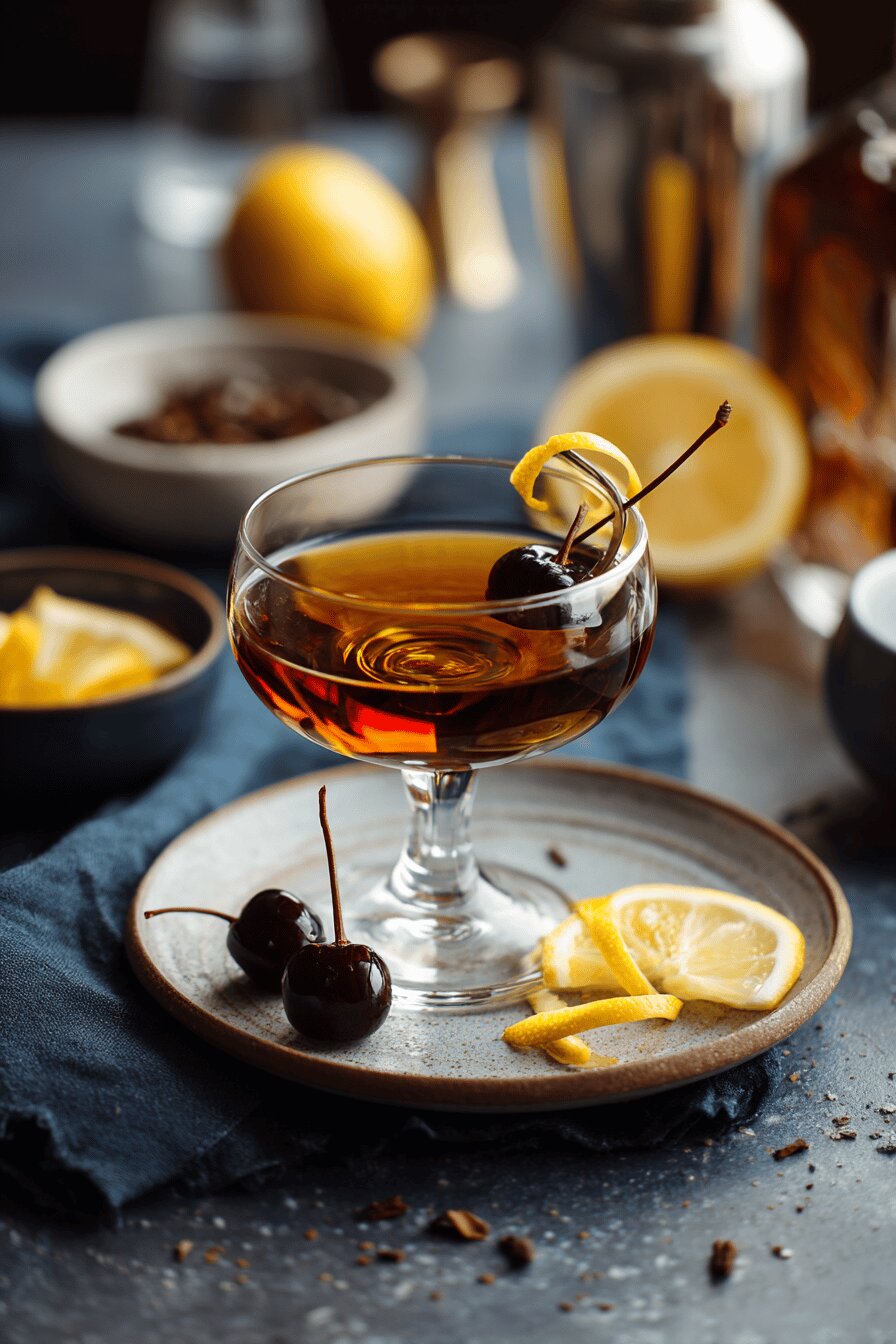Use rye whiskey for backbone but aged rum acts as solvent if rye is unavailable—notes richer, spiced rum preferred. Sweet vermouth amount dialed down a bit to maintain spirit presence; homemade or quality bottled options improve taste massively—cheap vermouth kills nuance. Allspice dram swaps cherry syrup; if unavailable, substitute 5 ml pure maple syrup and a dash of ground allspice—stir well to incorporate soluble flavors. Orange bitters replace Angostura; more citrus punch, less clove. Luxardo cherry key: not the sickly sweet bright red maraschino but preserved, dark cherry rich with natural sugars, adds balance rather than sweetness overload. Fresh lemon peel—not pre-cut zests—high oil content for aroma. Ice cracked, not cubed solid blocks—melts slower, controls dilution.