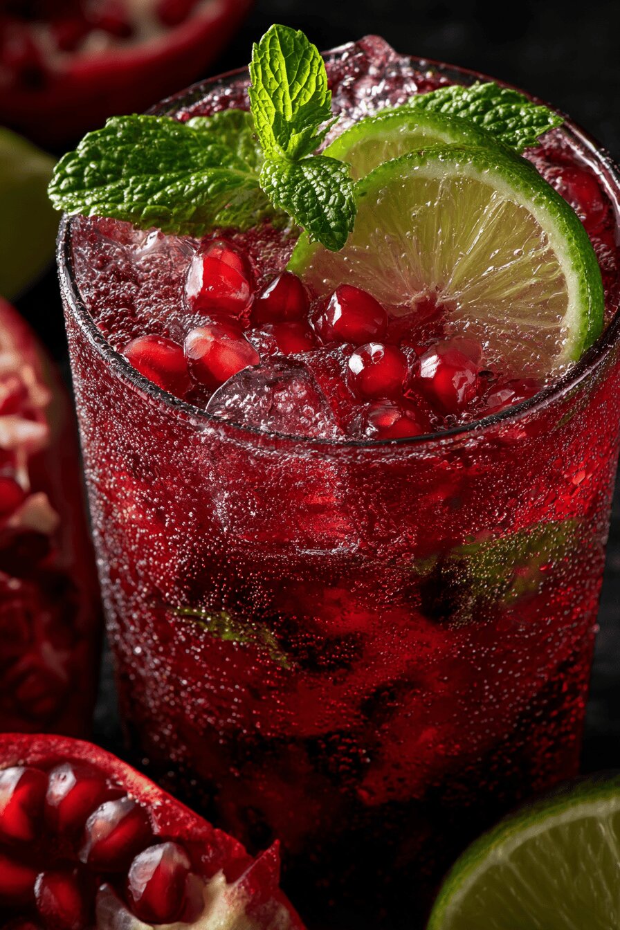 A zesty non-alcoholic drink blending 7 ml (1 1/2 tsp) pomegranate syrup with 425 ml (1 3/4 cups) sparkling ginger beer, ice cubes, and two knotted lime zest strips. Cinnamon syrup adds warmth, and fresh crushed mint leaves bring brightness. Serve chilled.