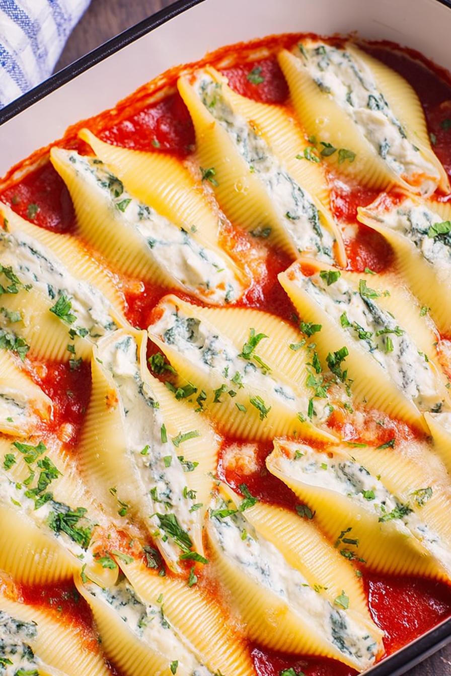 Ricotta-stuffed shells. Simple pasta that looks impressive. You need jumbo shells because small ones won’t hold much filling, frustrating and messy. Timing boils down to shell texture. No mushy blobs here. Use salted water; builds base flavor inside pasta. Wilt spinach properly, no excess water or filling turns watery later. Garlic aroma marks readiness, so don’t wander. Combining cheese, egg, and Italian seasoning binds filling and tricks texture into being creamy yet stable. Layering sauce in bottom avoids sticking and burning bottom shells. Cover baffling keeps moisture in, but final crisp topping is where the cheese cues you on doneness. Let sit before serving or filling blobs spill out. Leftover shells reheat well but avoid microwave sogginess—oven or skillet heat work best. Substitution ideas at bottom.