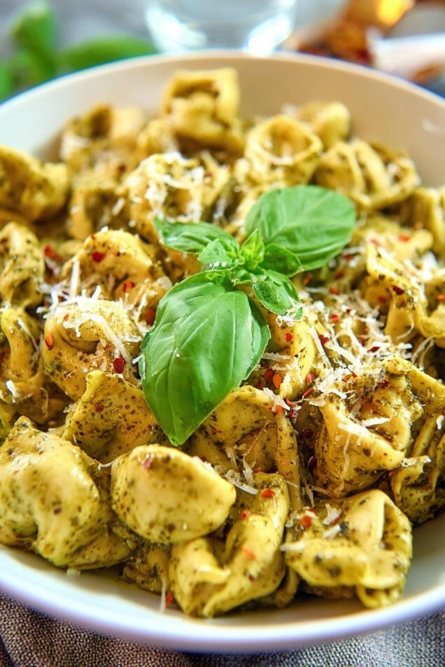 Pasta timing is a sensory game. Listen to the water bubbling, watch tortellini float when almost ready. Bite test wins every time; no clocks. After draining, return tortellini to the warm pot instead of cold bowl to avoid cooling that makes sauce adherence tough. Warm pesto gently; high heat kills basil flavor and turns cheese grainy. Toast nuts separately or toss in warm pesto to release oils slowly—don’t burn or they taste bitter. Add cheese gradually—half in sauce build-up, half as topping for texture contrast. Use pasta water sparingly; better to add a teaspoon than a cup at once. Toss gently to avoid tearing pasta sealed by thin dough skin. Serve hot. Overcooked tortellini breaks apart and cheese clumps—watch tightly. If leftovers, add water when reheating to restore creamy texture but never microwave dry pasta. Always taste and adjust salt and pepper before serving.