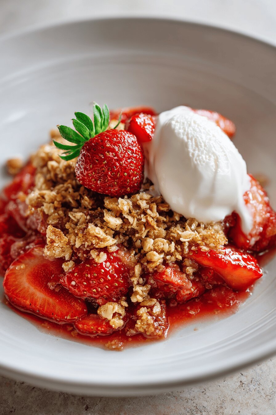 Reducing the strawberry quantity compensates for concentrated fruit juice texture with arrowroot replacing cornstarch — better translucent finish, no pasty haze. Lemon juice cuts the overly sweet syrup, balancing tart bright flavors. Swapping oat for spelt flour lowers gluten slightly, helps absorb moisture more evenly. Coconut oil is a cleaner fat alternative to butter that crisps well at moderate heat. Brown sugar replaced by coconut sugar offers complex caramel notes and less moisture, improving shelf life if refrigerating leftovers. Cinnamon adds aromatic warmth. If needed, replace coconut oil with cold butter but expect bubble intensity to vary slightly; adjust cooking time by a minute or two accordingly. Fresh strawberries should be firm, not soft or overly juicy to avoid runny outcome.