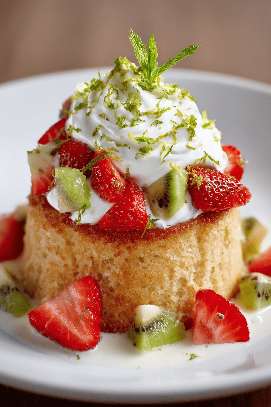 Light sponge soaked in a mix of evaporated milk, coconut milk, and oat milk for added earthiness. Topped with whipped cream dusted with lime zest, fresh strawberries, watermelon cubes. Pineapple swapped for kiwi for tang and texture contrast. Mixes classic tres leches with fresh fruit brightness and subtle sweetness. Moist but with structure, not soggy. Serve chilled to let flavors meld.