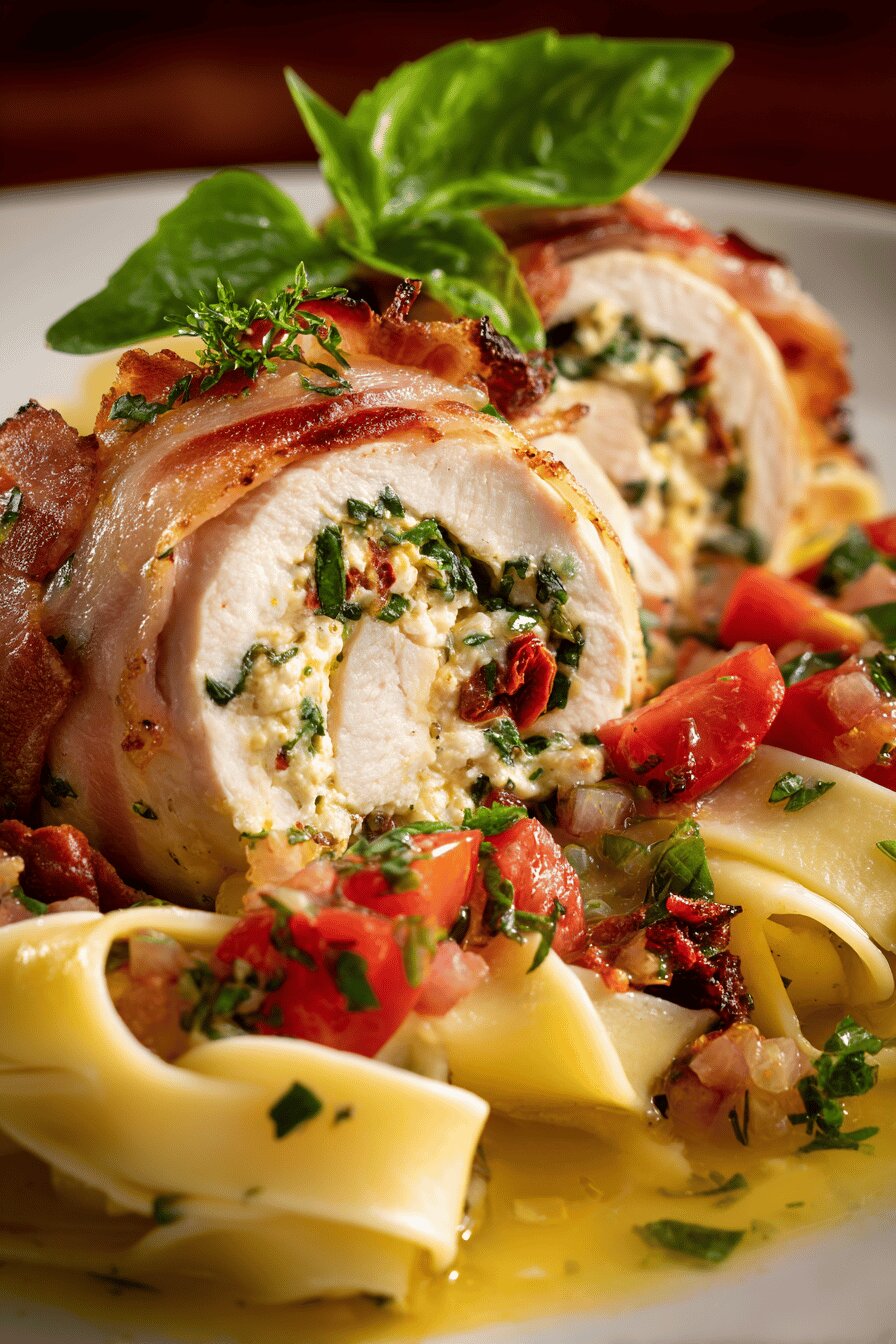Opening chicken breasts to create a pocket requires a steady knife and attention not to cut through completely. Filling should be evenly spread to avoid gaps. Pancetta hold the shape but toothpicks may be necessary if the meat tries to open during cooking. Sear chicken on all sides for that browning flavor; don’t overcrowd pan or temperature drops. Oven finish time varies depending on breast size; check for firmness and clear juices. Pasta water is salty so taste before adding extra salt to sauce. Adding wine to pasta after draining helps deglaze residual starch and lifts flavor. Toss gently but thoroughly. Serve hot immediately; pancetta can crisp slightly after cooking if resting too long.