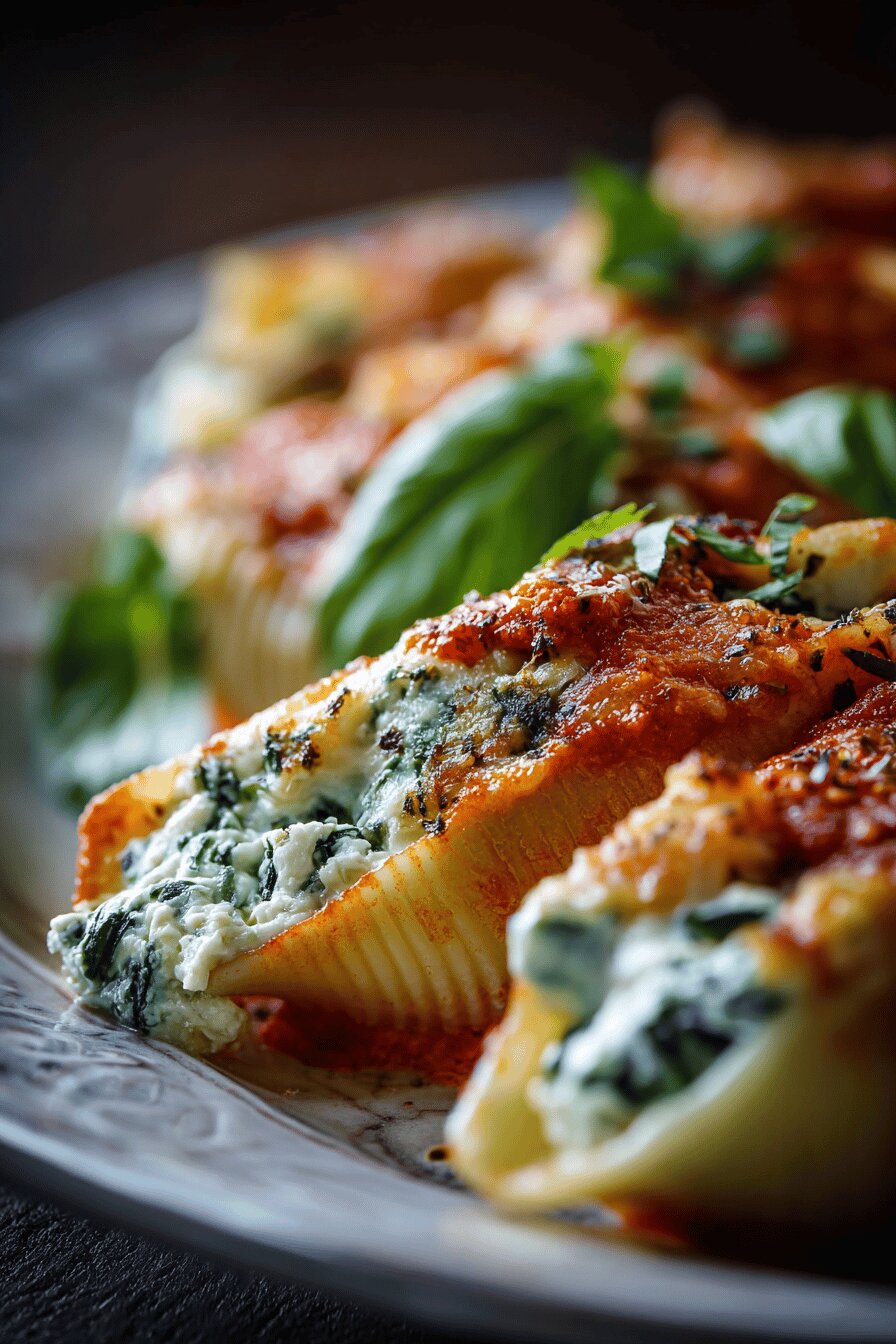 Large pasta shells filled with a creamy blend of ricotta and sautéed spinach, baked in a smoky roasted red pepper and tomato sauce. Uses different cheeses for depth and a hint of oregano for earthiness. Roasting peppers adds caramelization and smoky notes. Sauce smooth and rich, vibrant red and fragrant. Pasta al dente to hold filling without falling apart. Slow sauté of onions mellows sharpness, garlic softens. Finishes under broiler for golden cheesy crust. Vegetables well drained to avoid watery mess. Balanced savory, fresh herbs with subtle warmth from nutmeg and oregano.