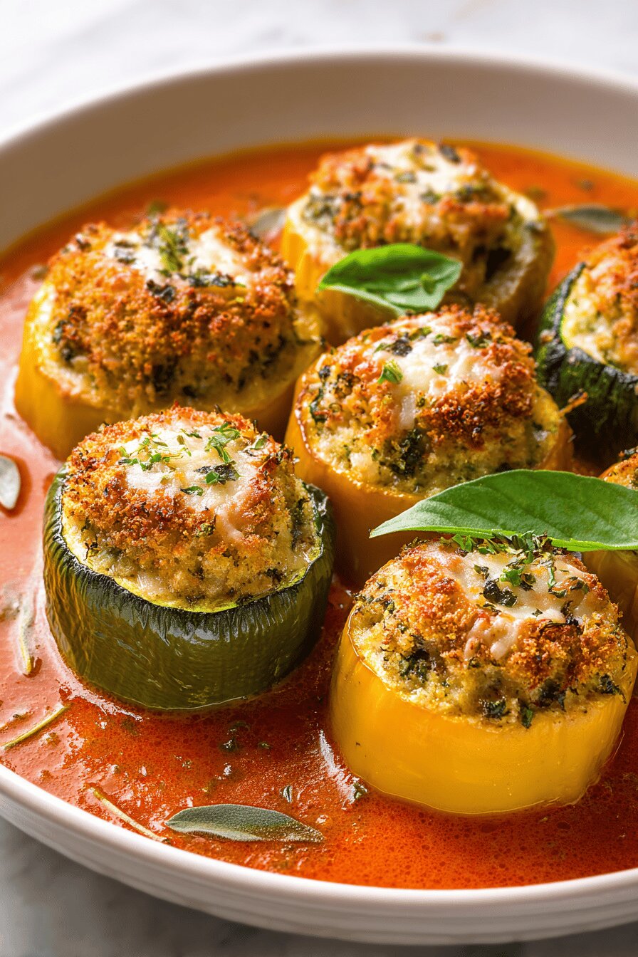 Prep vegetables carefully—hollowing too deep leads to soggy bottoms; too shallow yields scant filling. Cut bases flat for stability to avoid ugly tilts. Pan cook reserved vegetable scraps on mid heat; slow until moisture evaporates and mix looks pasty not runny—this is filling’s structural backbone. Warm broth crucial to hydrate crumbs effectively without prematurely setting egg. Mix gently but thoroughly. Stuffing tight enough to avoid air pockets, loose enough to allow heat expansion. Bake uncovered second phase to get crisp edges—foil will steam and soften topping too much. Watch roast as times vary with vegetable size: test doneness by piercing with skewer or touch. Filling browns when surface is golden and firm. Resting is key—cutting too soon leaks filling and juice out. If sauce reduces too much, add a touch extra broth during second bake. To save time, sauce and filling can be done simultaneously. Use sharp knife to loosen filling without puncturing vegetables during prep—avoid fracture.