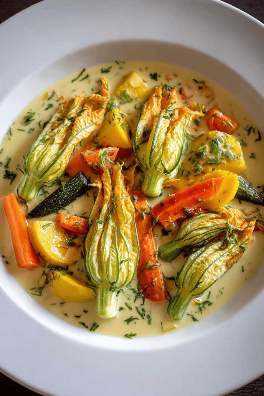 Zucchini flowers filled with a medley of summer vegetables, simmered cream reduced to balance richness. Aromatic herbs—rosemary swapped for thyme, parsley for basil—brighten layers. White wine swapped for dry vermouth adds subtle depth. Slow sauté brings out natural sweetness in carrots and celery; bell pepper replaced by diced yellow squash for gentle flavor twist. Finished gently braised in a light vegetable broth. Techniques focus on tight folding of fragile petals, reducing risk of tearing. A simple dish packing vegetable essence, creamy texture, fresh herbs. No gluten, no nuts, no eggs. Timing tricks anchored on visual cues: butter bubbling low, cream thickening till silk, broth simmer whisper before oven drop.
