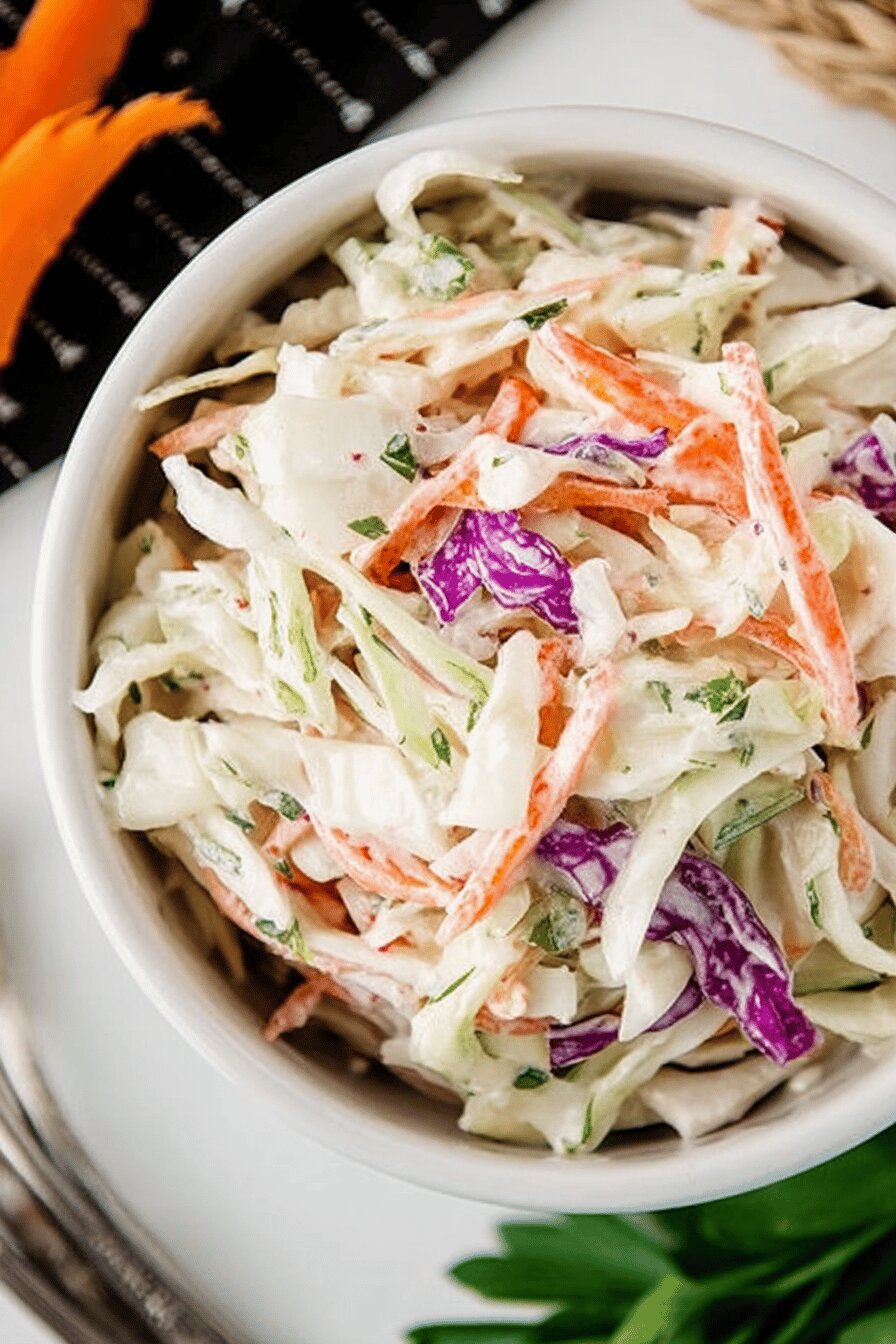 A creamy, crunchy cabbage and carrot slaw with a tangy twist using Greek yogurt and apple cider vinegar. Swapped parsley for cilantro and green onions for chives. Lightly sweetened with honey instead of sugar. Chill to let flavors marry but watch the crunch. Easy on prep but no shortcuts on tossing well. Serves a crowd, perfect for BBQs or weeknight sides.