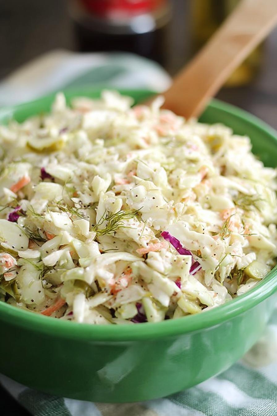 Crunchy cabbage blend tossed in a tangy, herb-laced dressing with mayo, chopped pickles, and a citrusy zip from lemon juice. The dill replaced by fresh thyme for earthiness; garlic swapped for smoked paprika to add warmth without overpowering. Dressing rested in fridge for flavor melding that’s crucial. The slaw offers sharp acidity balanced by creamy texture, crispy bite from fresh veggies. Perfect as a side for barbecues or creamy counterpoint to fried food. Practical, straightforward, no fluff. Serves six. Adjust salt mid-ready because cabbage volume impacts final seasoning. Pickle juice acidity varies, so taste early and often. Fast prep, no-cook solution that benefits from sitting. Calories bumped slightly from extra mayo. Actual timing: If prep ahead, 1.5 to 2 hours rest ideal—flavors marry, crunch stays.