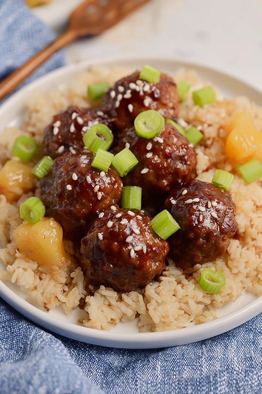 Ground beef formed into firm balls baking until golden, then simmered in a tangy glaze. Uses panko for lighter texture replacing plain crumbs. Instead of ketchup, tomato paste with honey shifts the sweetness and acidity. Garlic powder swapped for fresh shallots for mellow sharpness. Sauce thickened with arrowroot, giving sheen and clarity. Simmer time adjusts to let flavors fuse but not dry out meatballs. Garnished with black sesame seeds and fresh chives, adding color and crunch. Prep and cooking guided by look and feel—golden crust, glossy dark sauce. Efficient steps to avoid soggy meatballs while keeping them juicy.