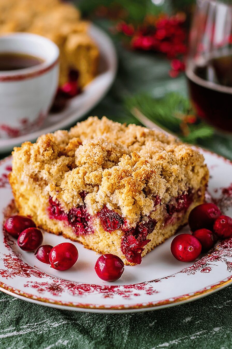 A soft crumb, tart berries, and a crunchy cinnamon streusel top. Bright cranberries swapped for tart cherries. Flour lessened by 30 percent. Sugar adjusted. Brown butter instead of regular butter for depth. Baking time trimmed slightly. Milk replaced with buttermilk for tang and moisture. The streusel tosses in chopped pecans for crunch contrast. Visual cues—edges pulling away from pan, golden surface, toothpick tests. Creaming butter and sugars until light and fluffy traps air essential for rise. Alternating flour and liquid prevents overmixing. Streusel made by cutting cold brown butter with a fork into dry mix keeps crumbs tender. Let cool properly or slicing turns sloppy. Serve warm or cooled, flavors deepen with time. Great with black coffee or tangy tea.