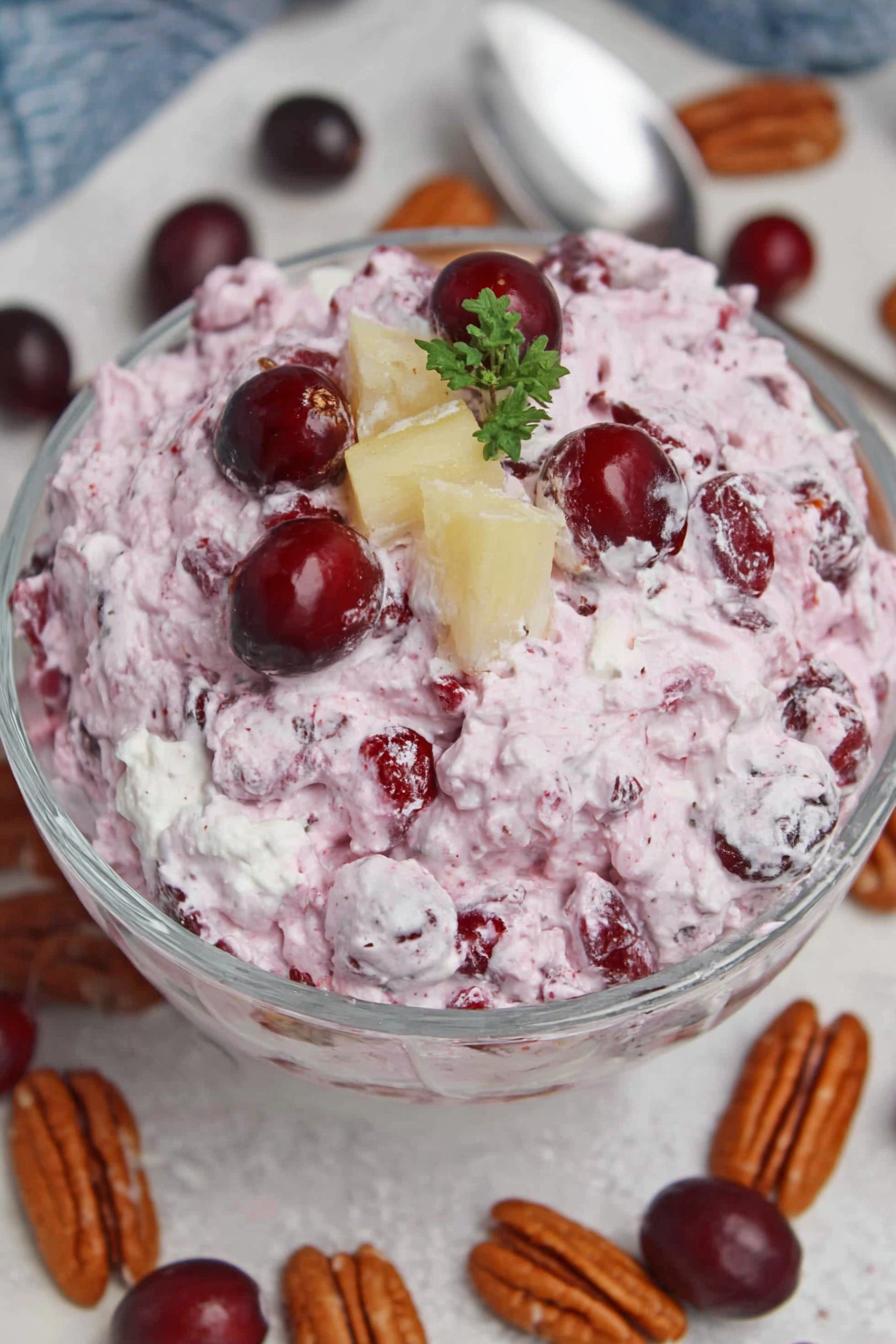A vibrant fruit fluff salad with tart cherries swapped for sour green apples and cranberries replaced by pomegranate seeds. Pineapple chunks retained but boosted with shredded coconut for texture. Brown sugar replaced granulated for richer flavor. Nuts switched from pecans to toasted walnuts. Mini marshmallows make the cut; whipped cream folded in creates light, airy texture. Resting time adjusted plus-minus 5 minutes. Multi-step process reworked to optimize flavors and textures while reducing excess moisture since soggy is the enemy here.