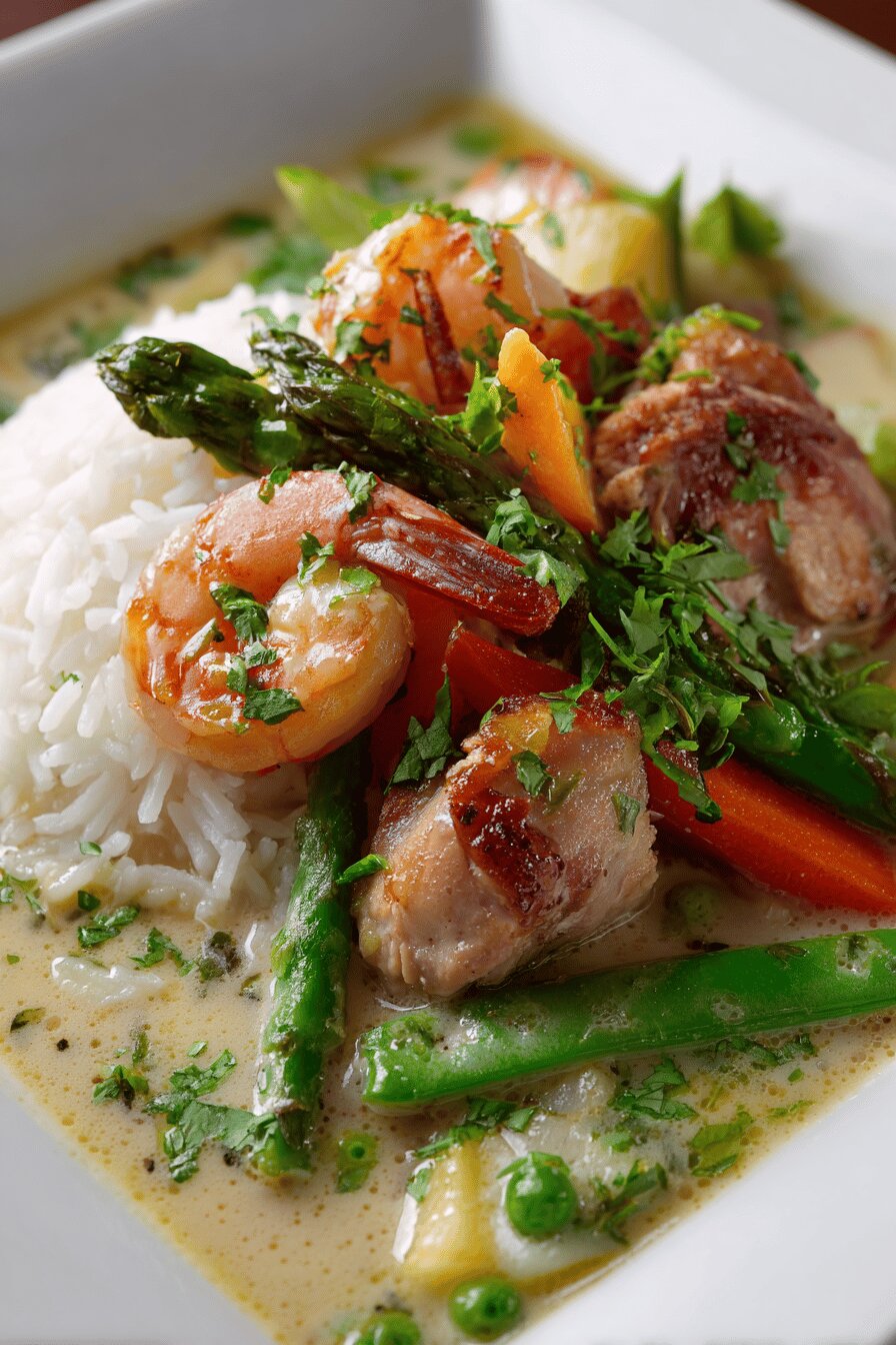 A hearty Thai-inspired soup merging tender chicken thighs with plump shrimp, fresh veggies, and fragrant aromatics in a creamy coconut broth. Rice cooks right in, soaking up flavors and adding body. Citrusy lemongrass and fresh ginger build layers while snap peas and carrots deliver crunch. Technique focuses on balancing textures, timing proteins just right, and coaxing maximum flavor from each step. Dairy-free, gluten-free, nut-free, and egg-free.