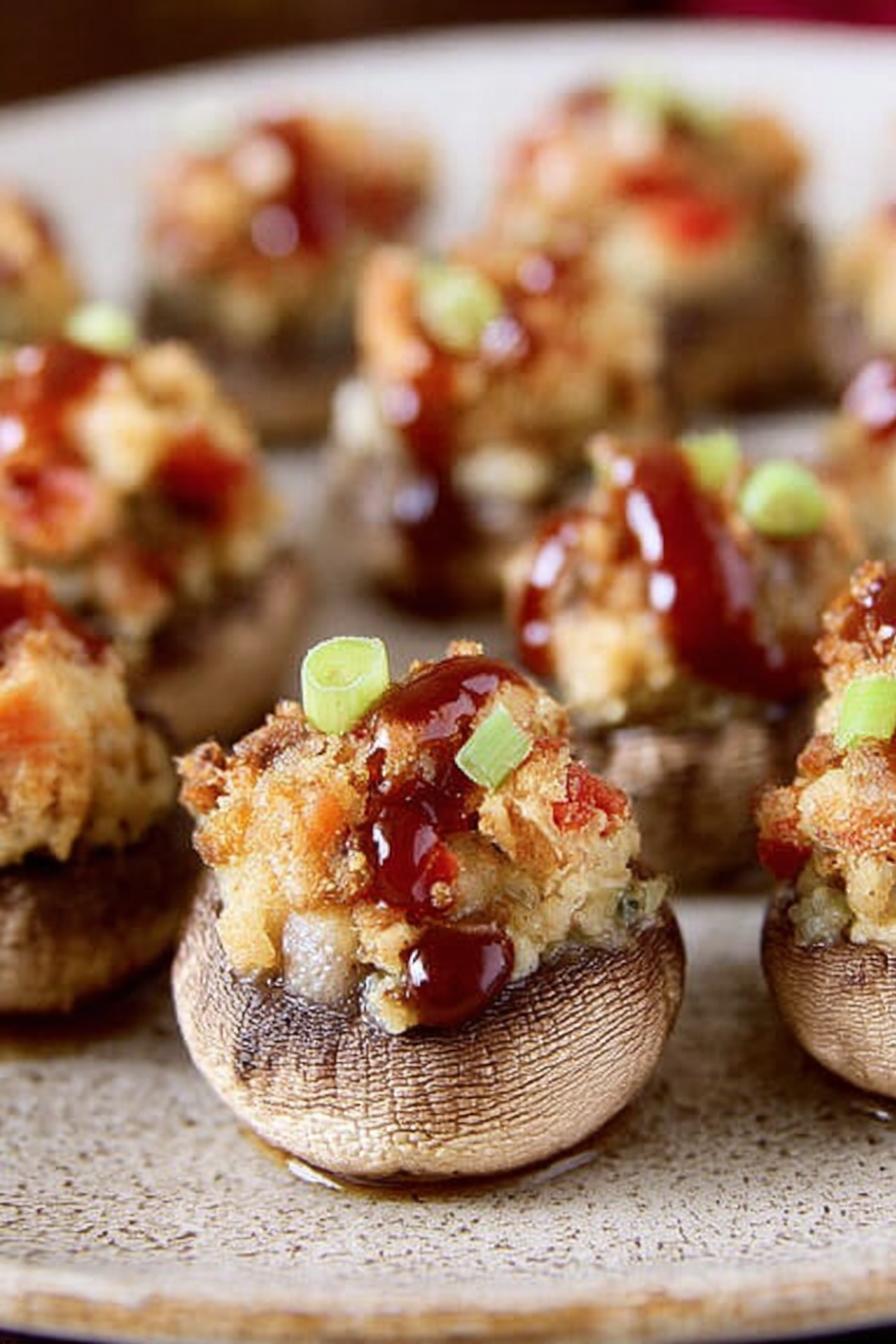 Roasted mushroom caps filled with a creamy herb bread mixture and sharp cheese. Cranberry sauce melted into a glaze topping that crackles when warm. Uses sage stuffing and swaps cheddar for fontina to add a mellow nutty kick. Time adjusted for gradual heating–no scorched edges. Focus on tactile feel of mushrooms for doneness, not just clocks. Clean and prep strategy to avoid soggy bottoms. Practical swaps like turkey gravy filling or cream cheese for easier pantry options. Visual changes from pale to golden topping key for pull-out timing. No em dashes used.