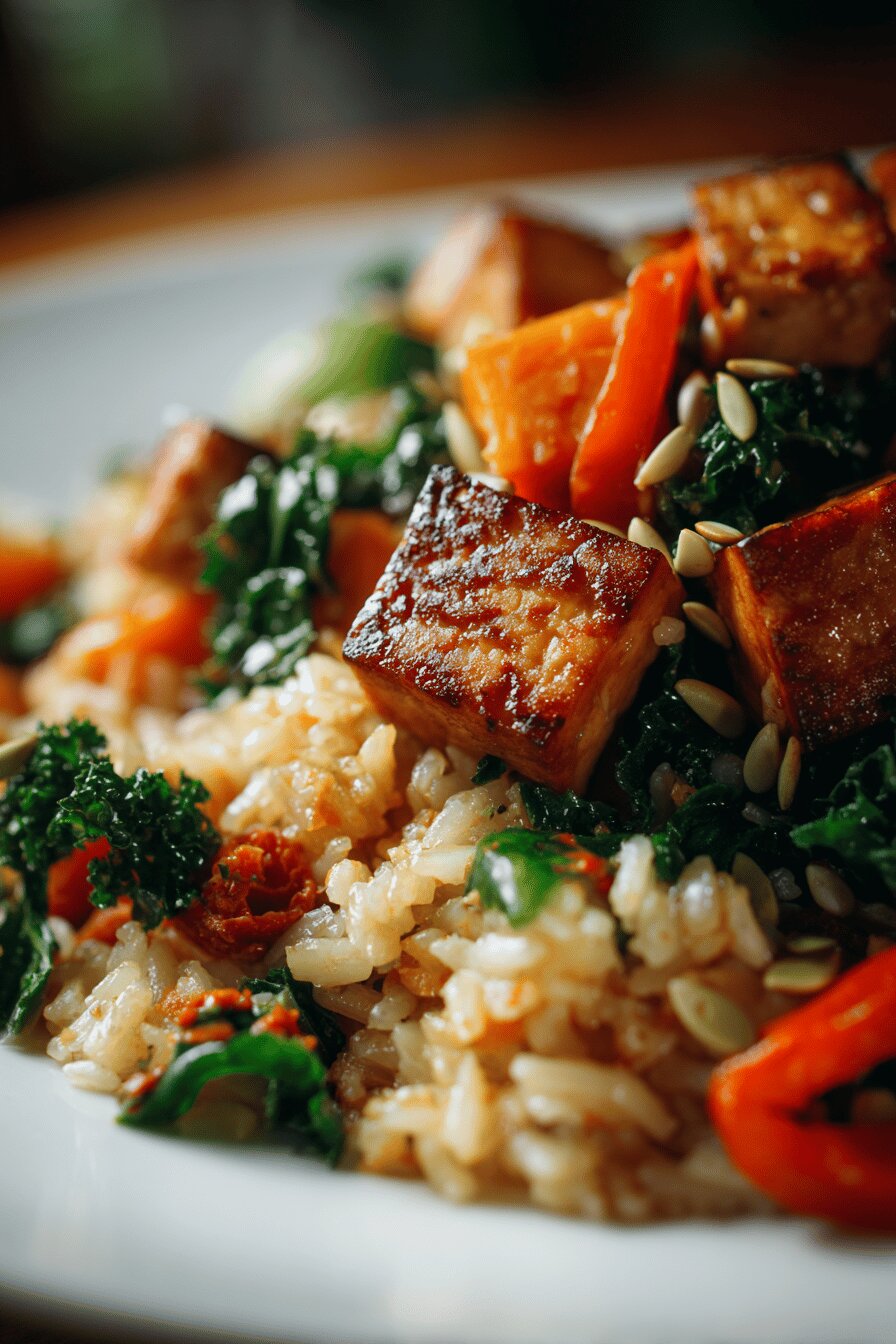 A smoky, vibrant fried rice tossed with firm tofu, sweet potatoes, bell peppers, and kale. Aromatic garlic and tangy lime lift the dish. Toasted coconut adds texture; sambal oelek brings heat. Uses jasmine rice for soft grains that separate well. Quick pan technique for browning tofu and tender veggies. Options to swap sweet potato for butternut squash or turnip; coconut flakes for toasted pumpkin seeds. Balanced, plant-based, nut-free, dairy and egg free. Serves 4 with a bright, citrus-fresh finish.